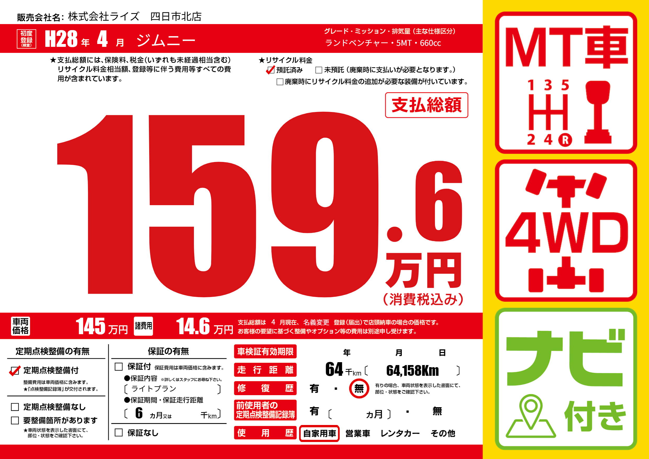 | 走行キロ | 6.4万km | 初年度登録 | H28年4月 |