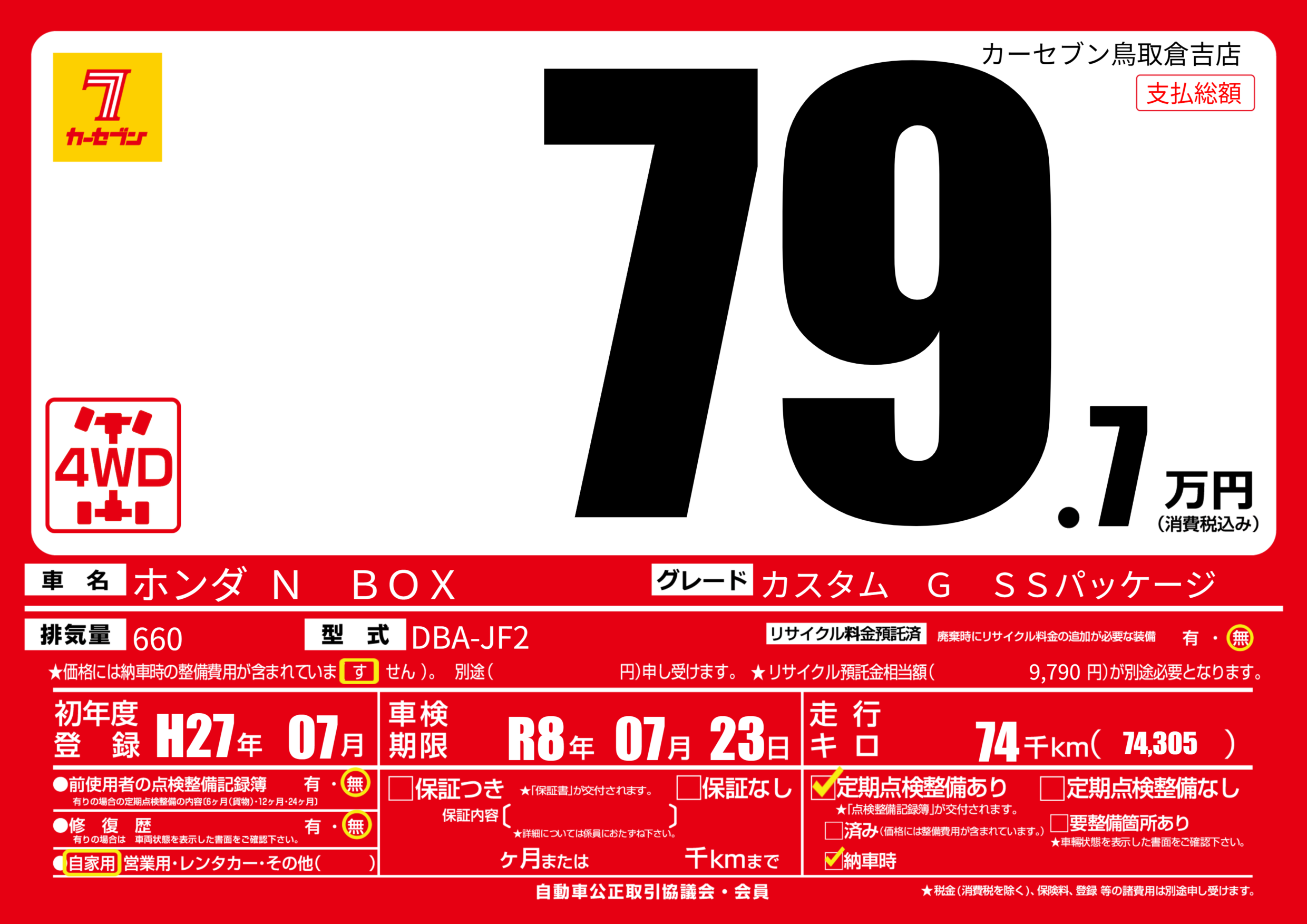 | 走行キロ | 7.4万km | 初年度登録 | H27年07月 |