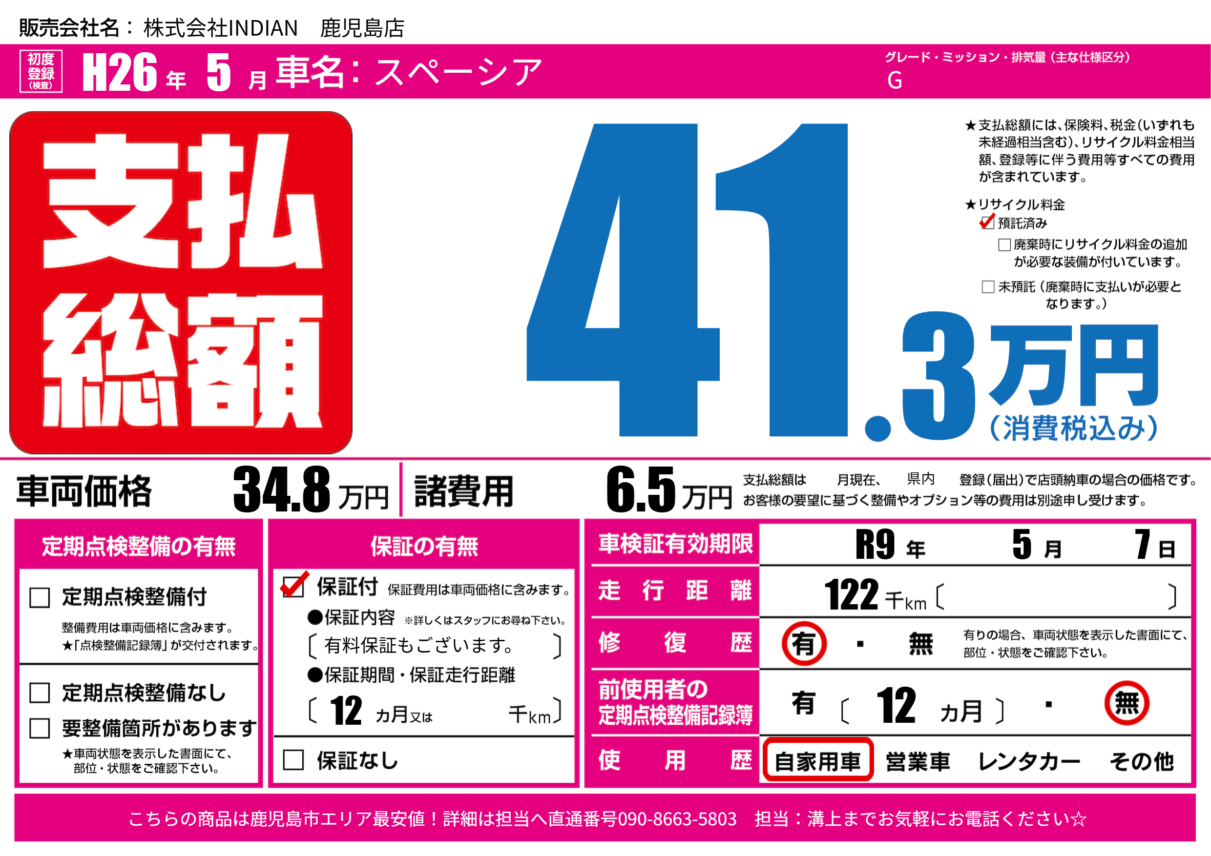 | 走行キロ | 12.2万km | 初年度登録 | H26年5月 |