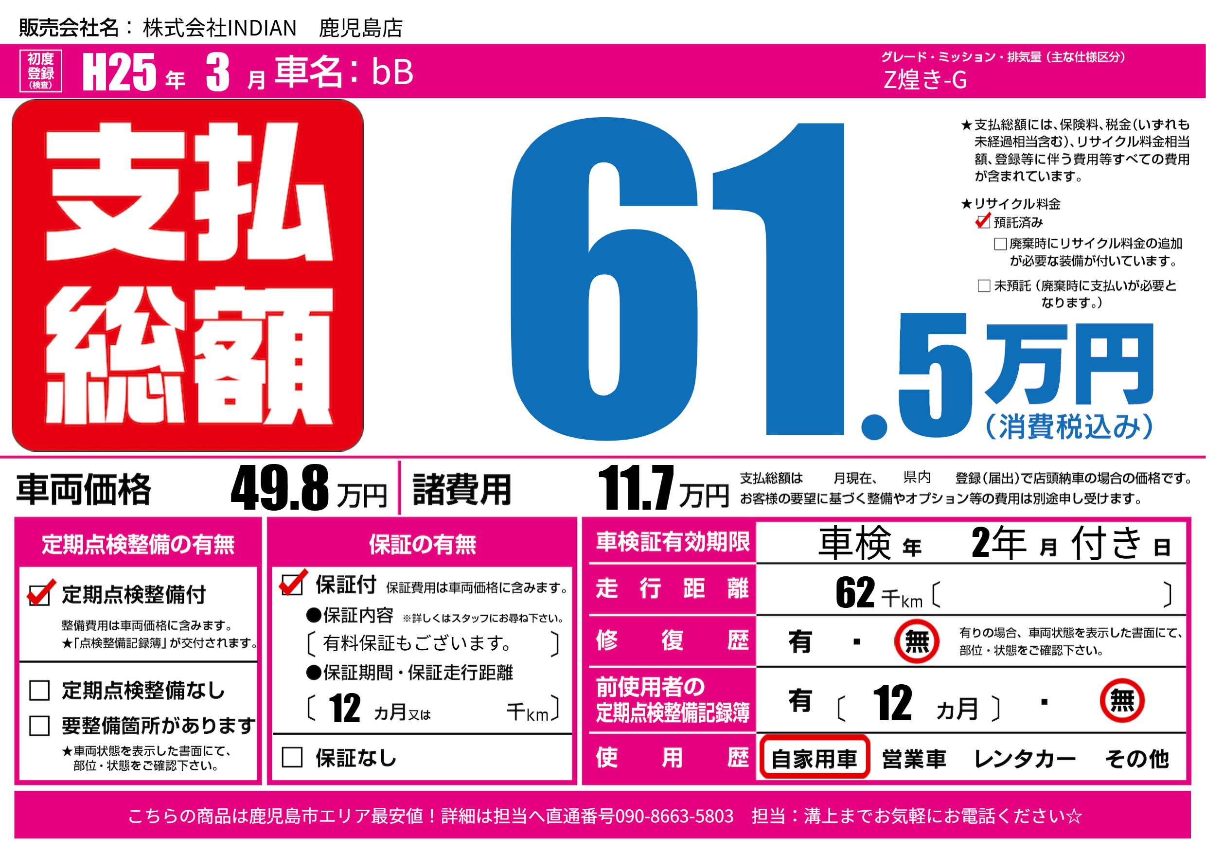 | 走行キロ | 6.2万km | 初年度登録 | H25年3月 |