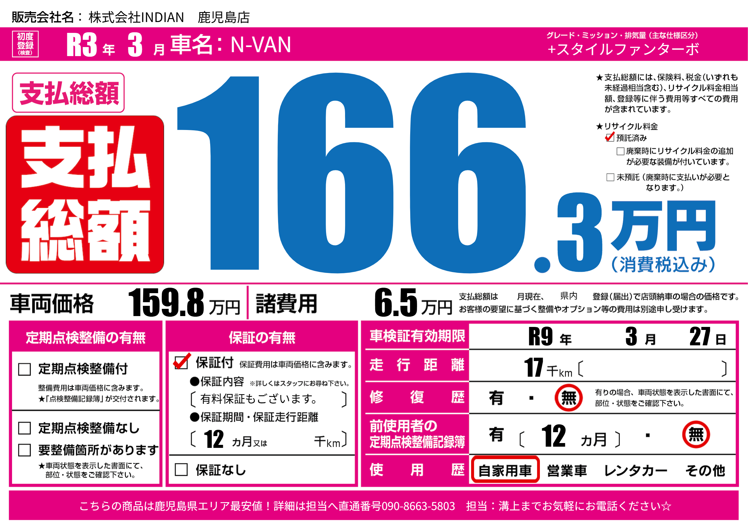 | 車名 | N-VAN | グレード ミッション 排気量 |