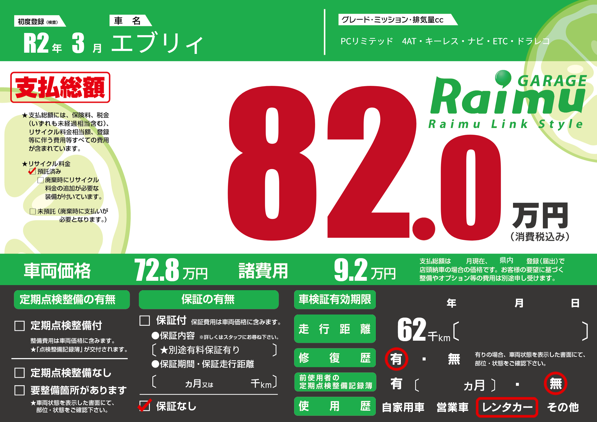 保証なし 保証内容(★別途有料保証有り) ---ヶ月または()千kmまで |