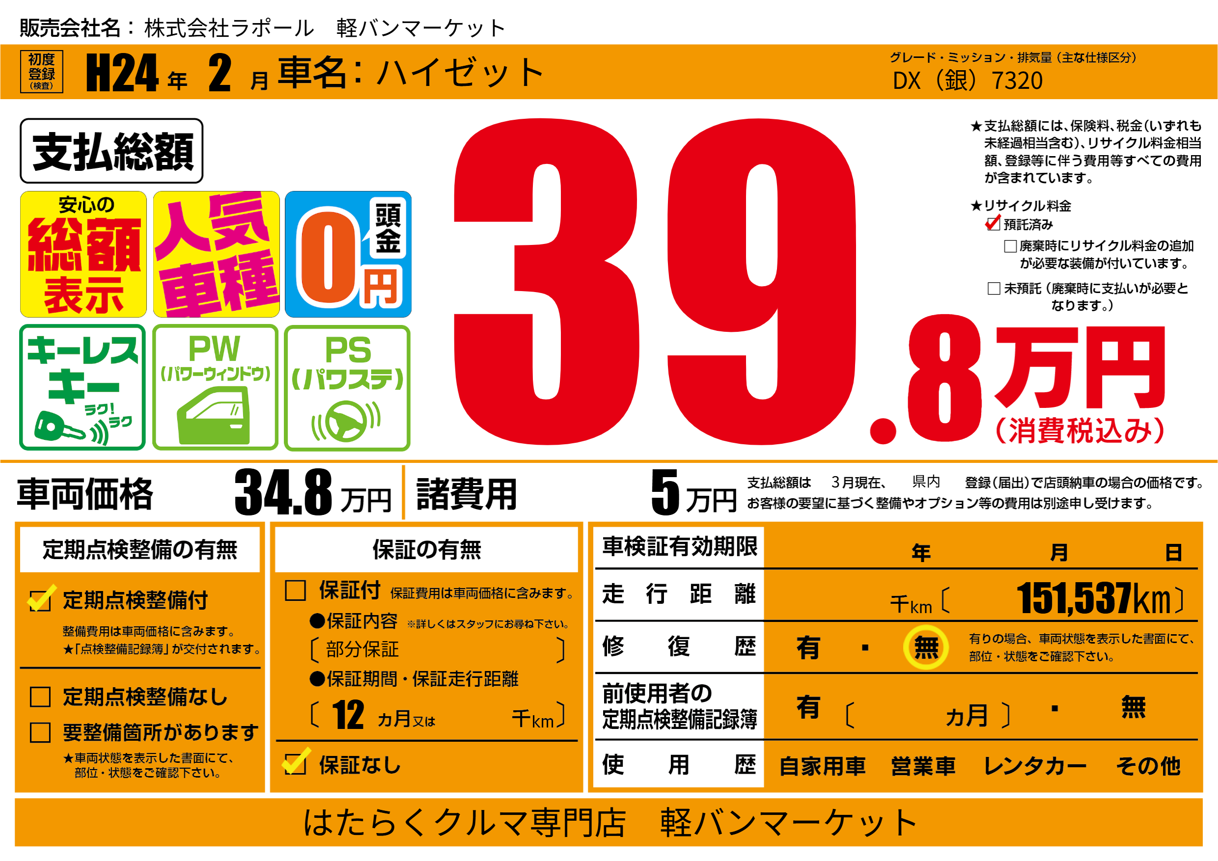| 車名 | ハイゼット | グレード ミッション 排気量 |