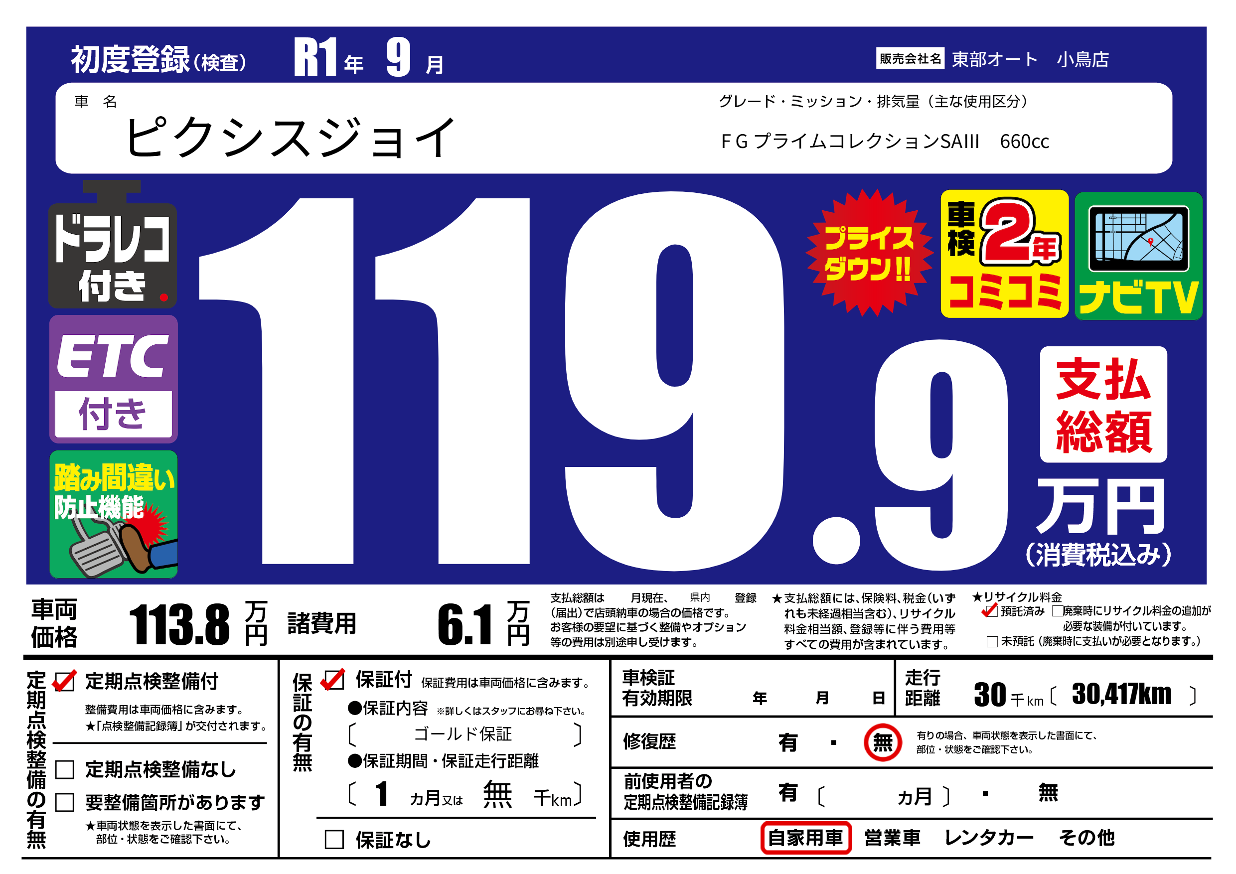 | 走行キロ | 3万km | 初年度登録 | R1年9月 |