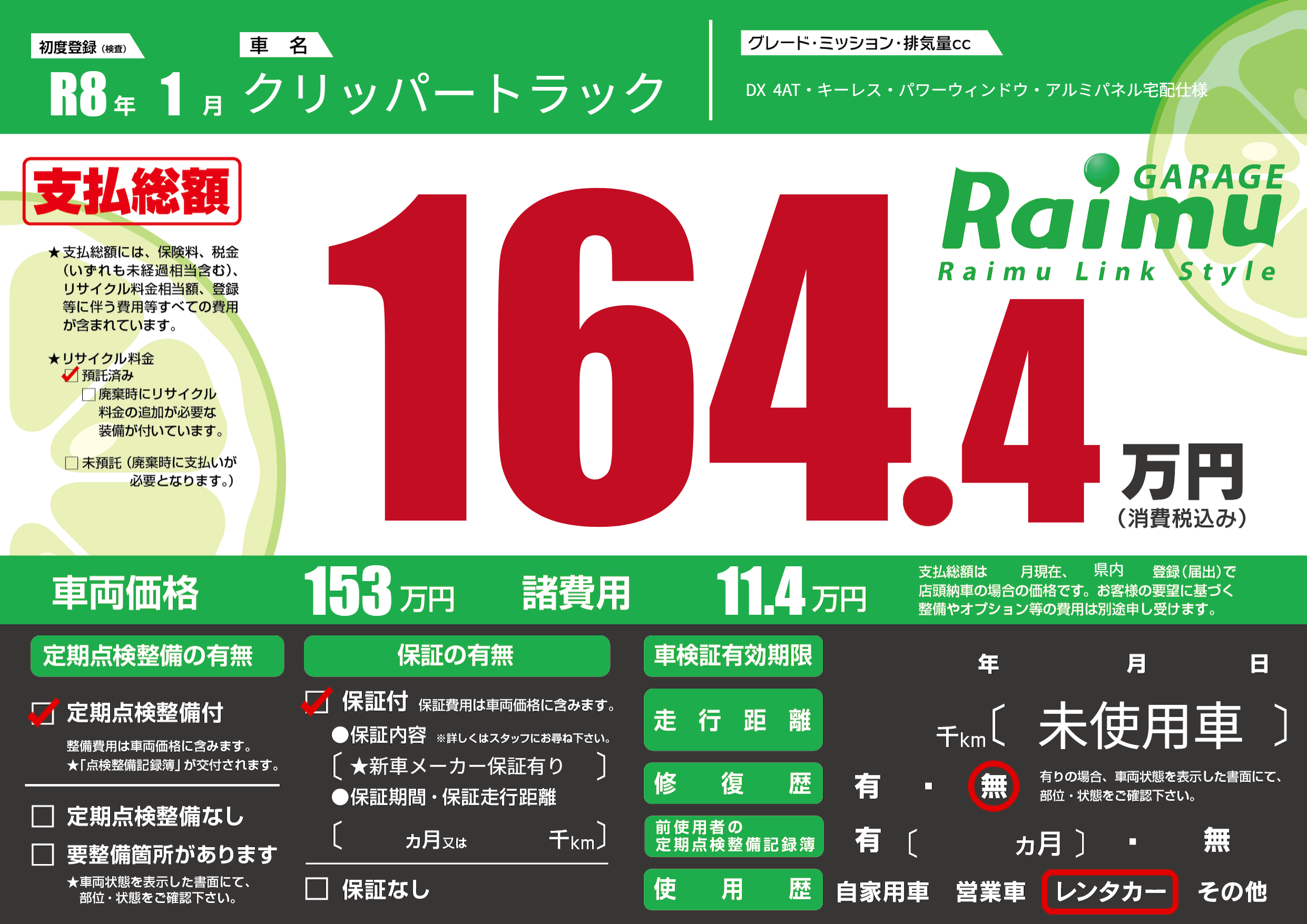 | 走行キロ | - | 初年度登録 | R8年1月 |