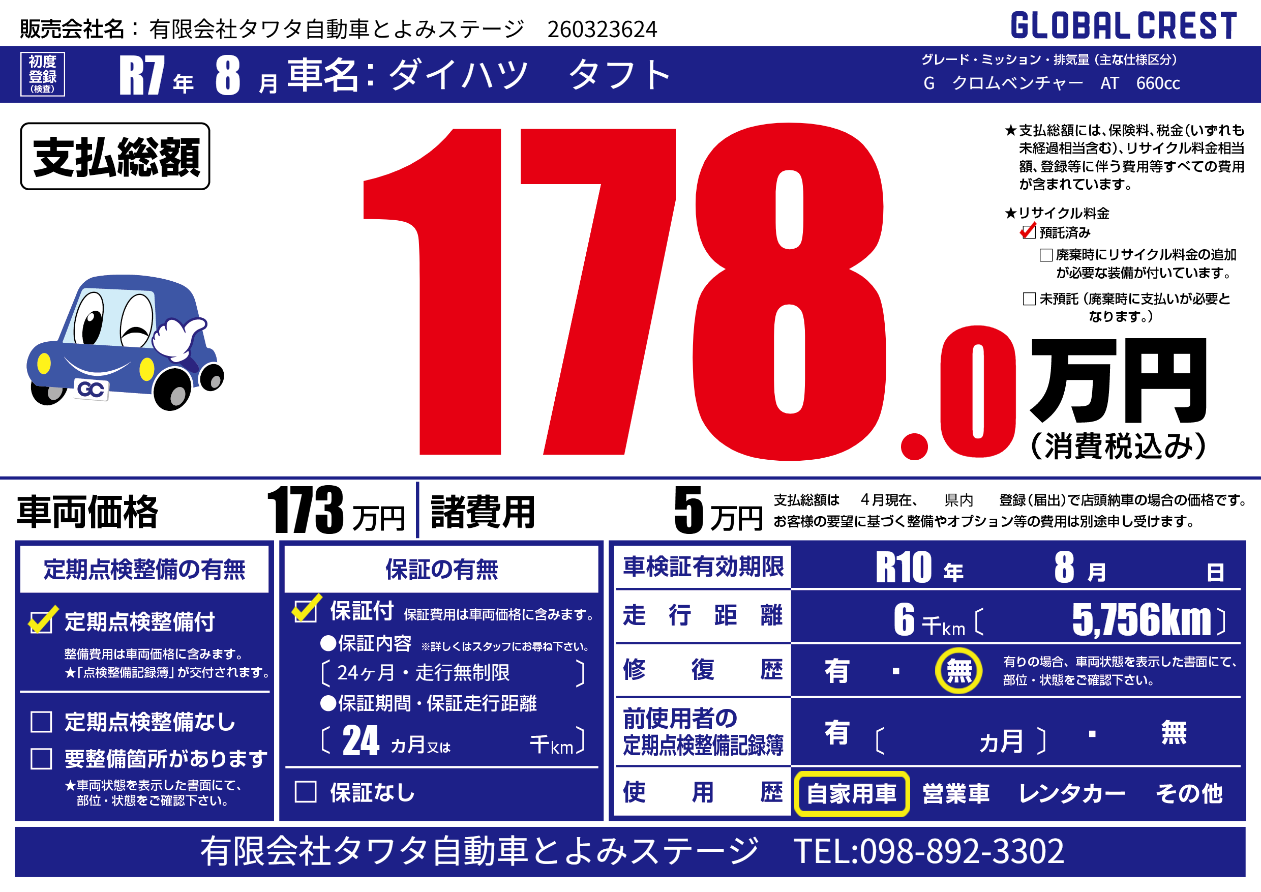 | 走行キロ | 0.6万km | 初年度登録 | R7年8月 |