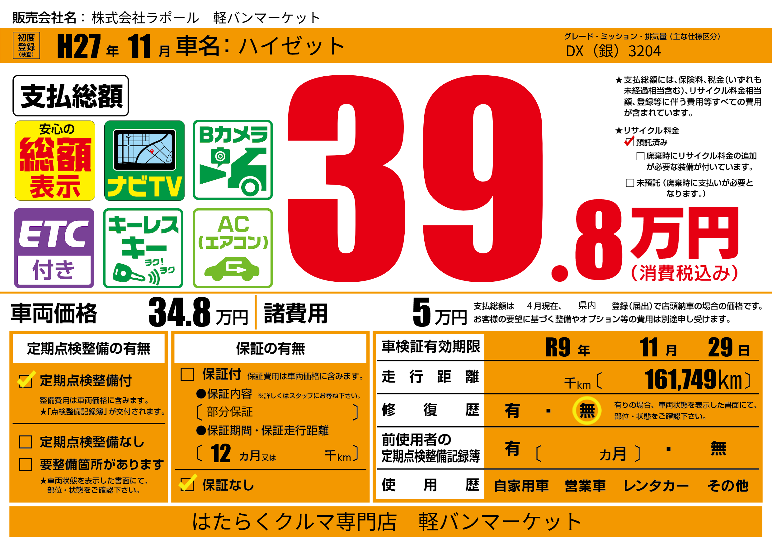 なし | 車検制限 | R9年11月29月 |