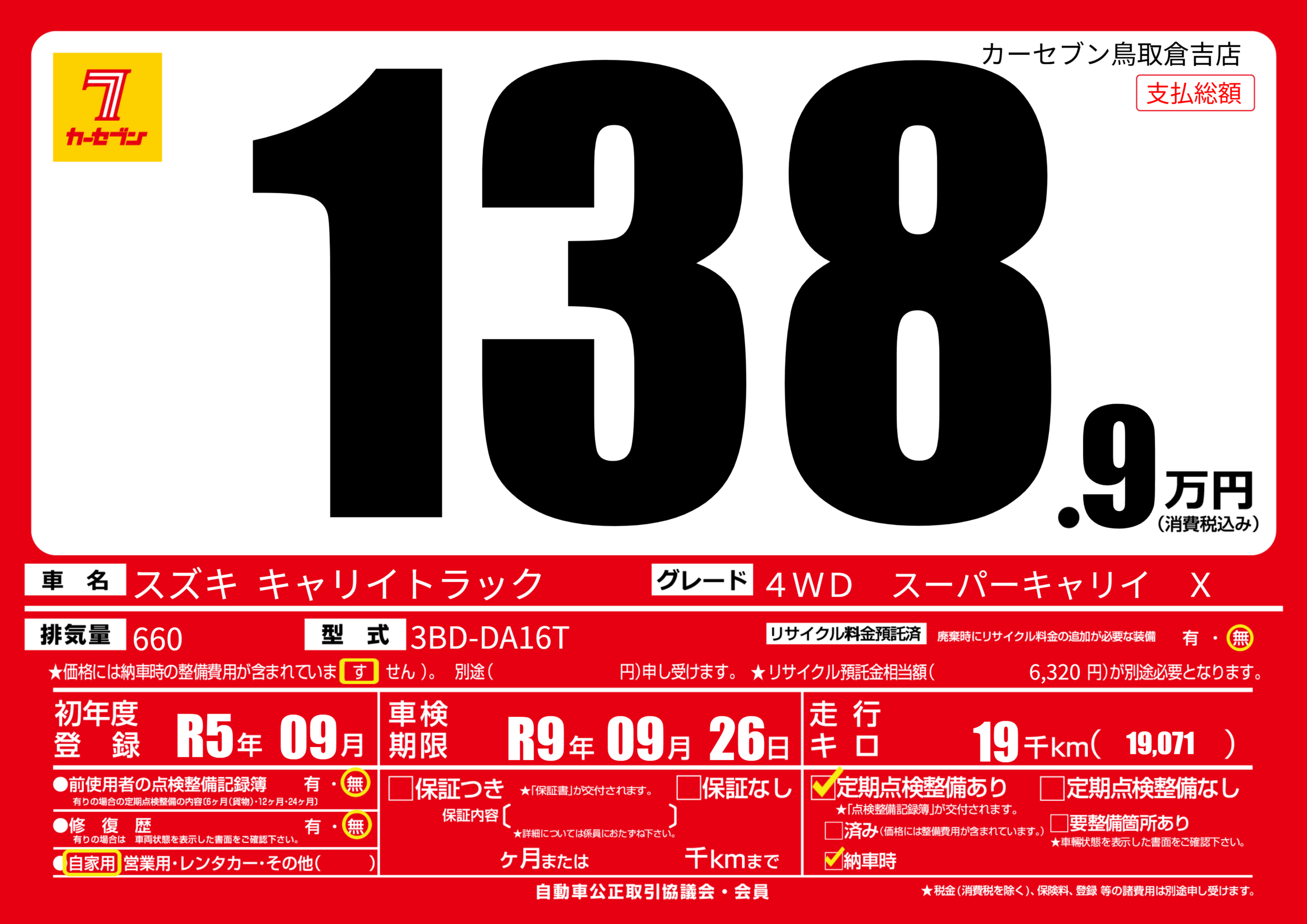 | 定期点検整備 | 定期点検整備あり 納車時あり | ||