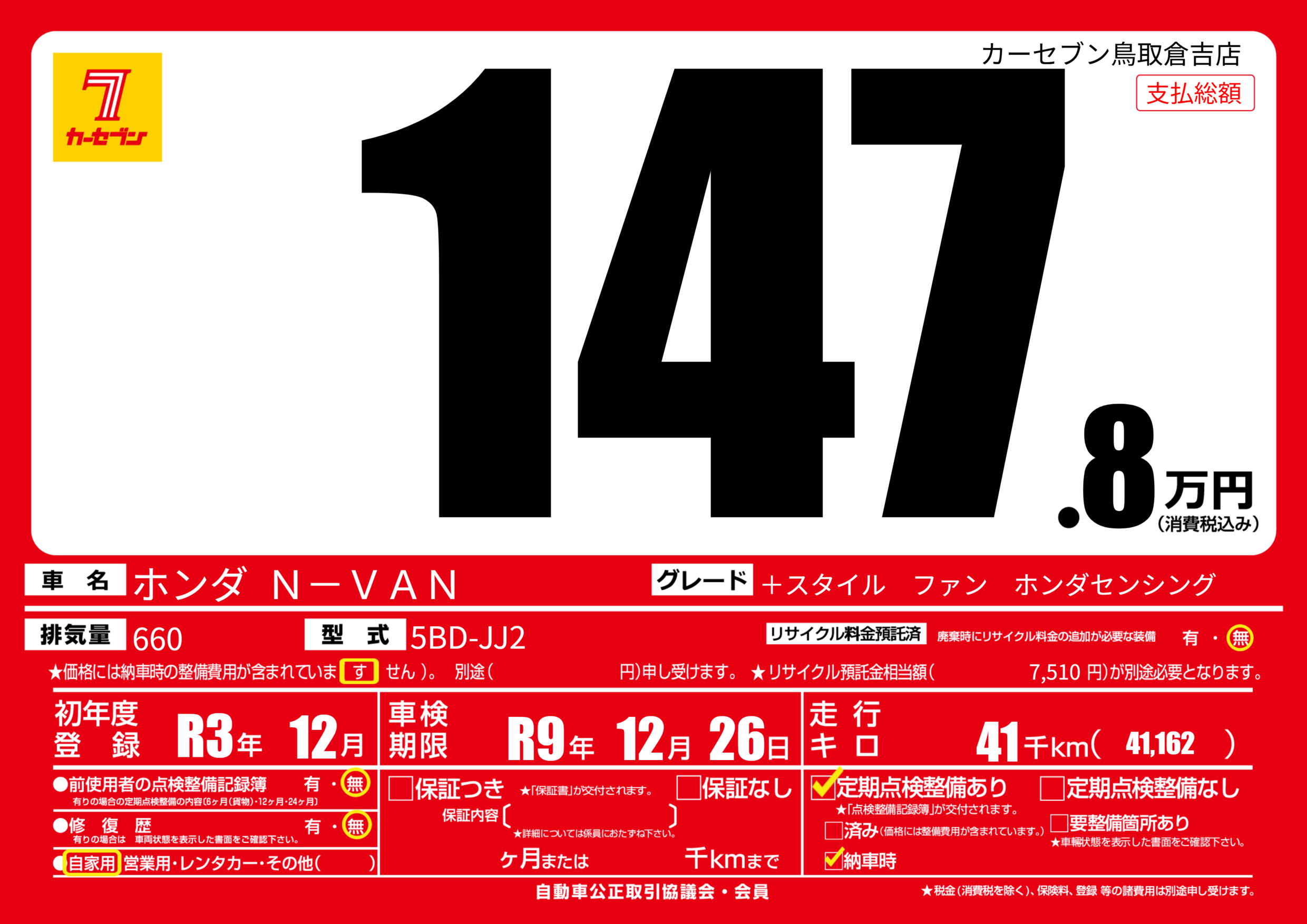 | 定期点検整備 | 定期点検整備あり 納車時あり | ||