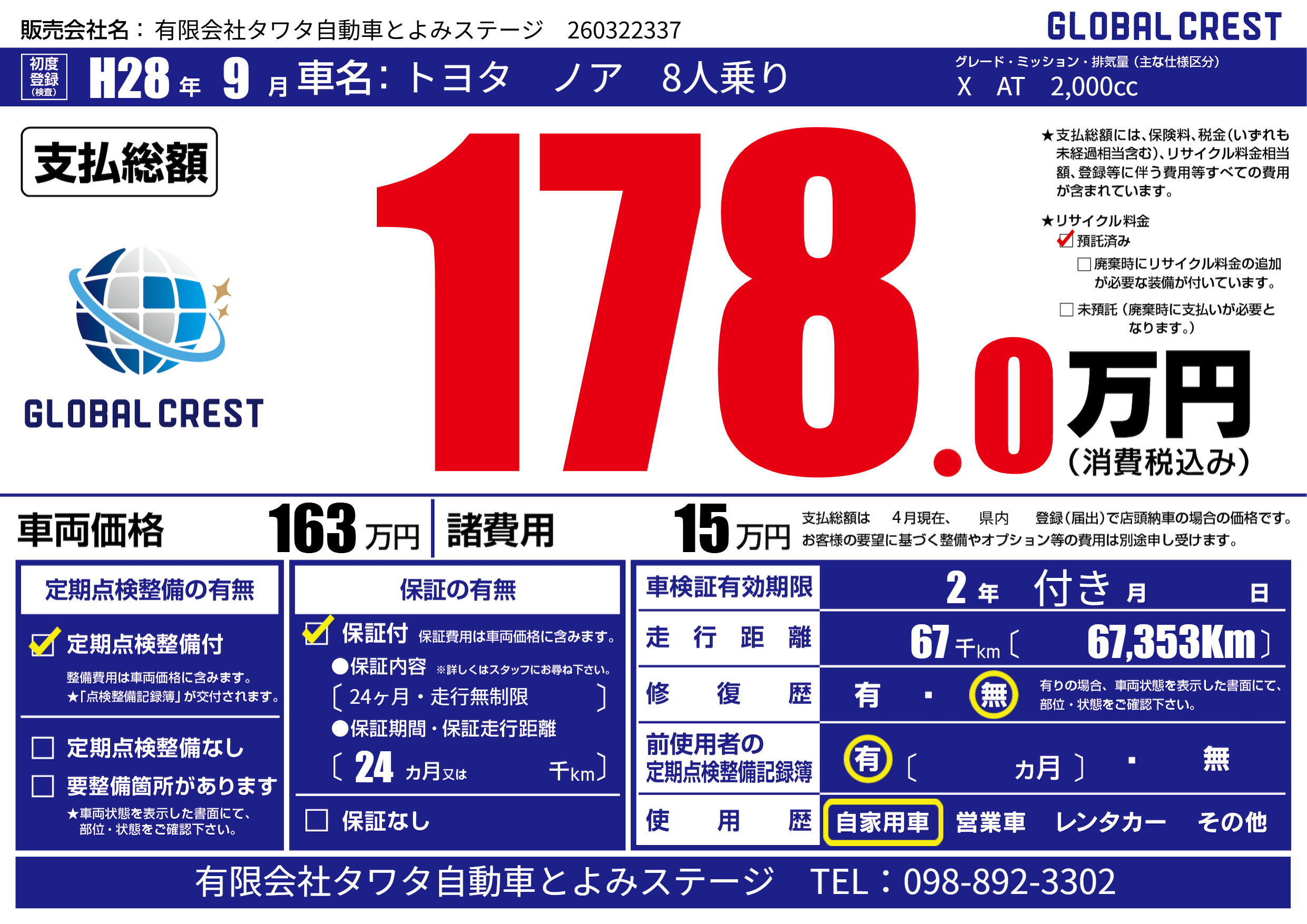 | 車名 | トヨタ ノア 8人乗り | グレード ミッション 排気量 |