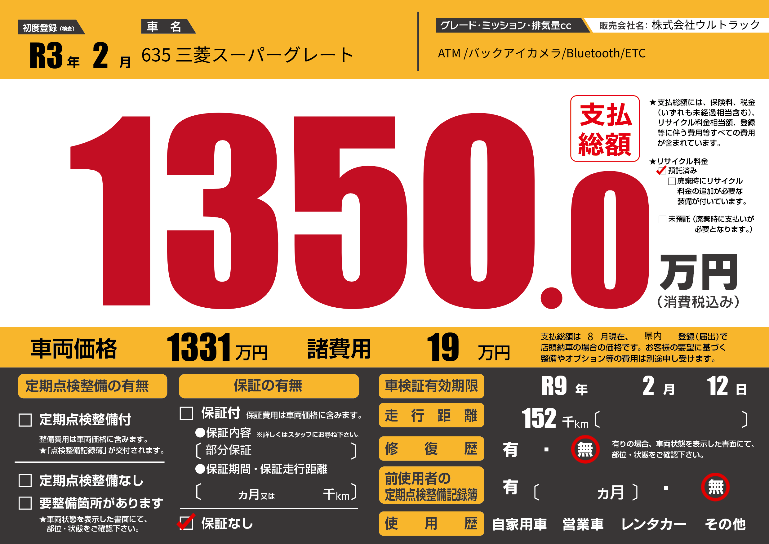 | 車名 | 635 三菱スーパーグレート | グレード ミッション 排気量 |