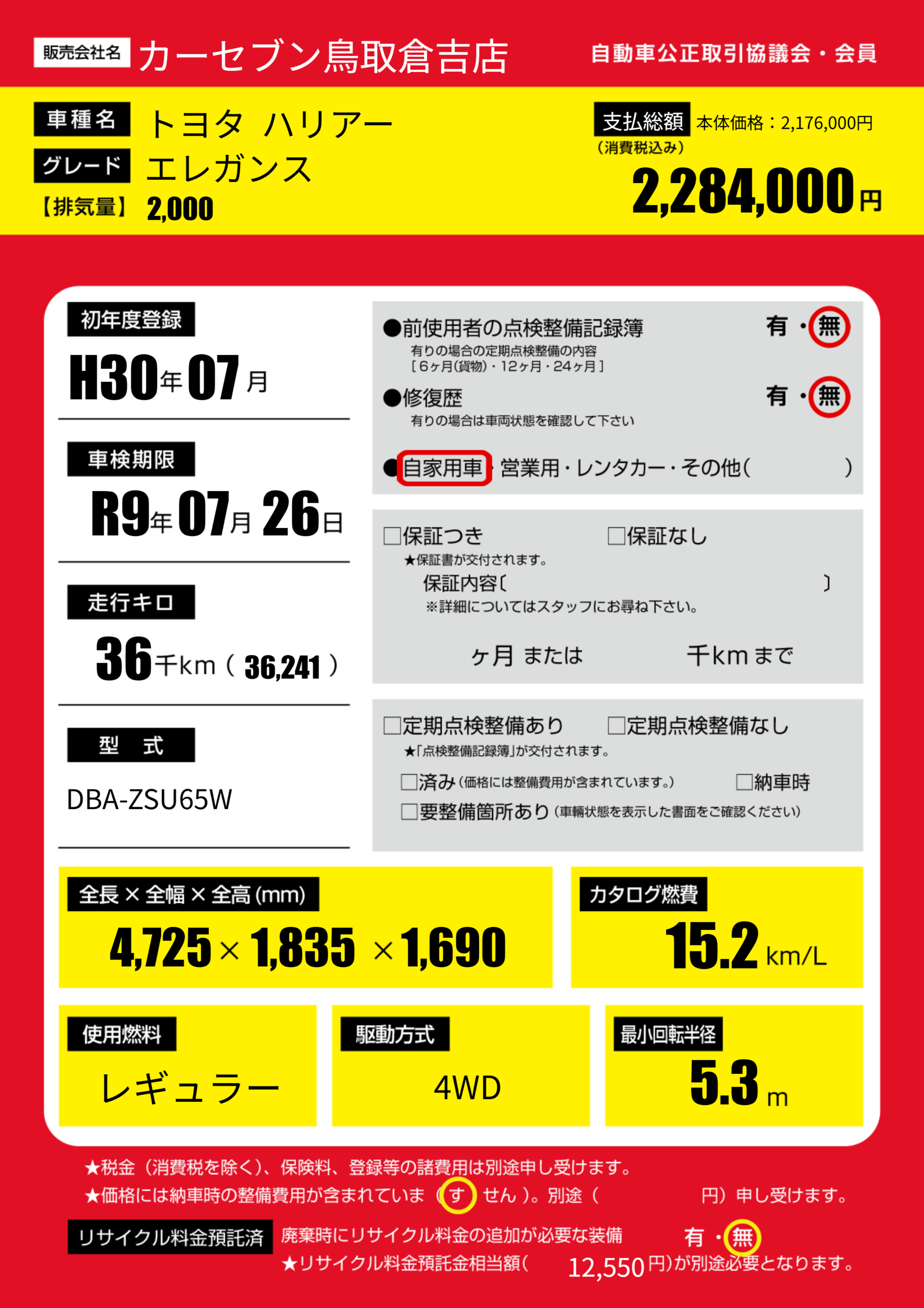 | 車検制限 | R9年 07月 26日 | ||