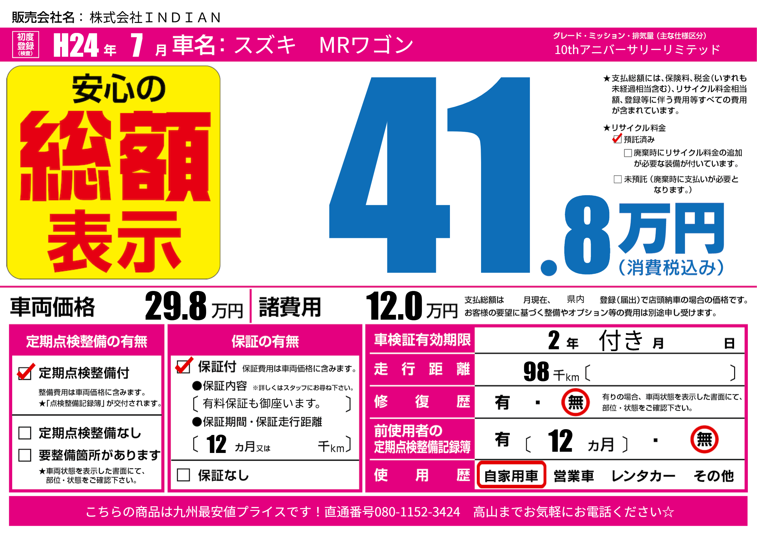 | 走行キロ | 9.8万km | 初年度登録 | H24年7月 |