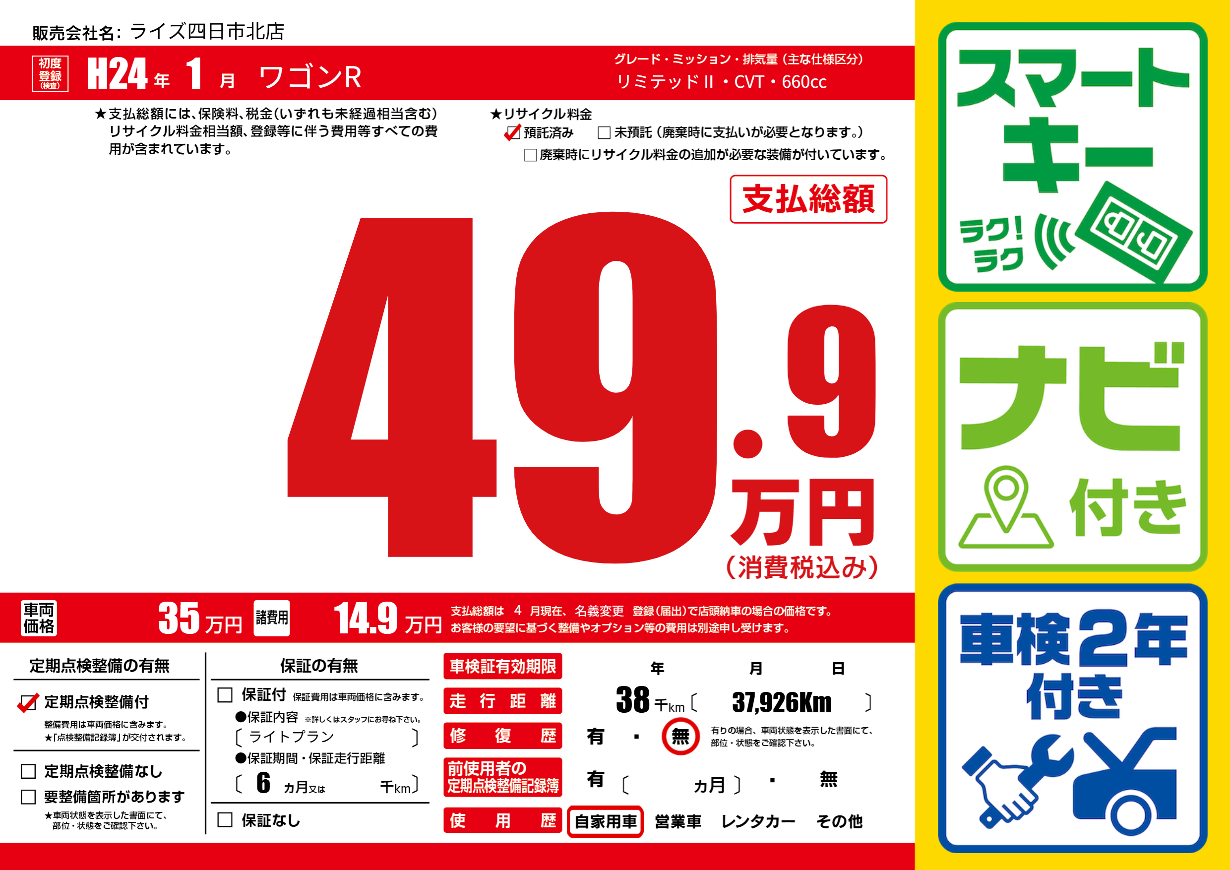 | 走行キロ | 3.8万km | 初年度登録 | H24年1月 |