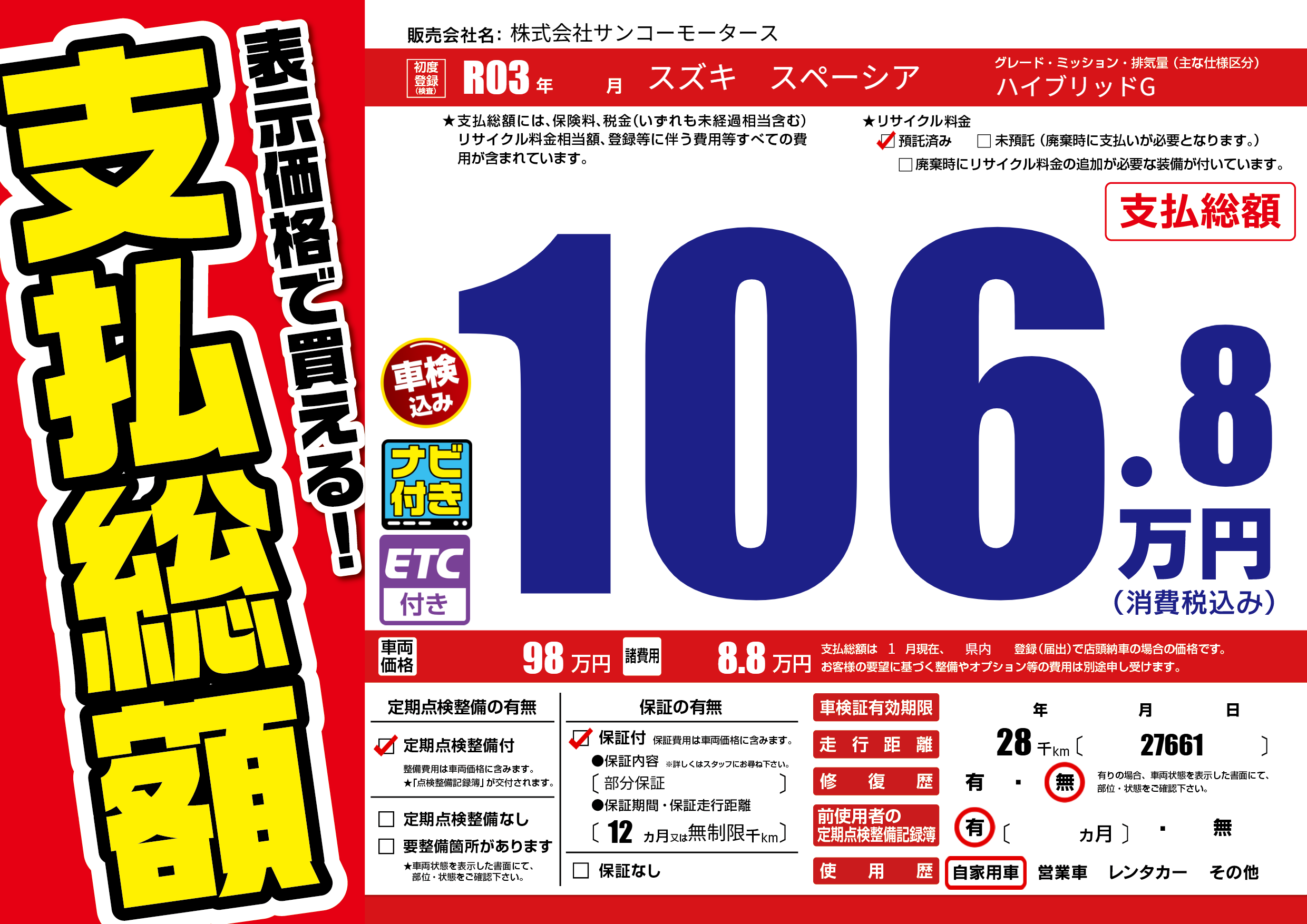 | 走行キロ | 2.8万km | 初年度登録 | R03年---月 |