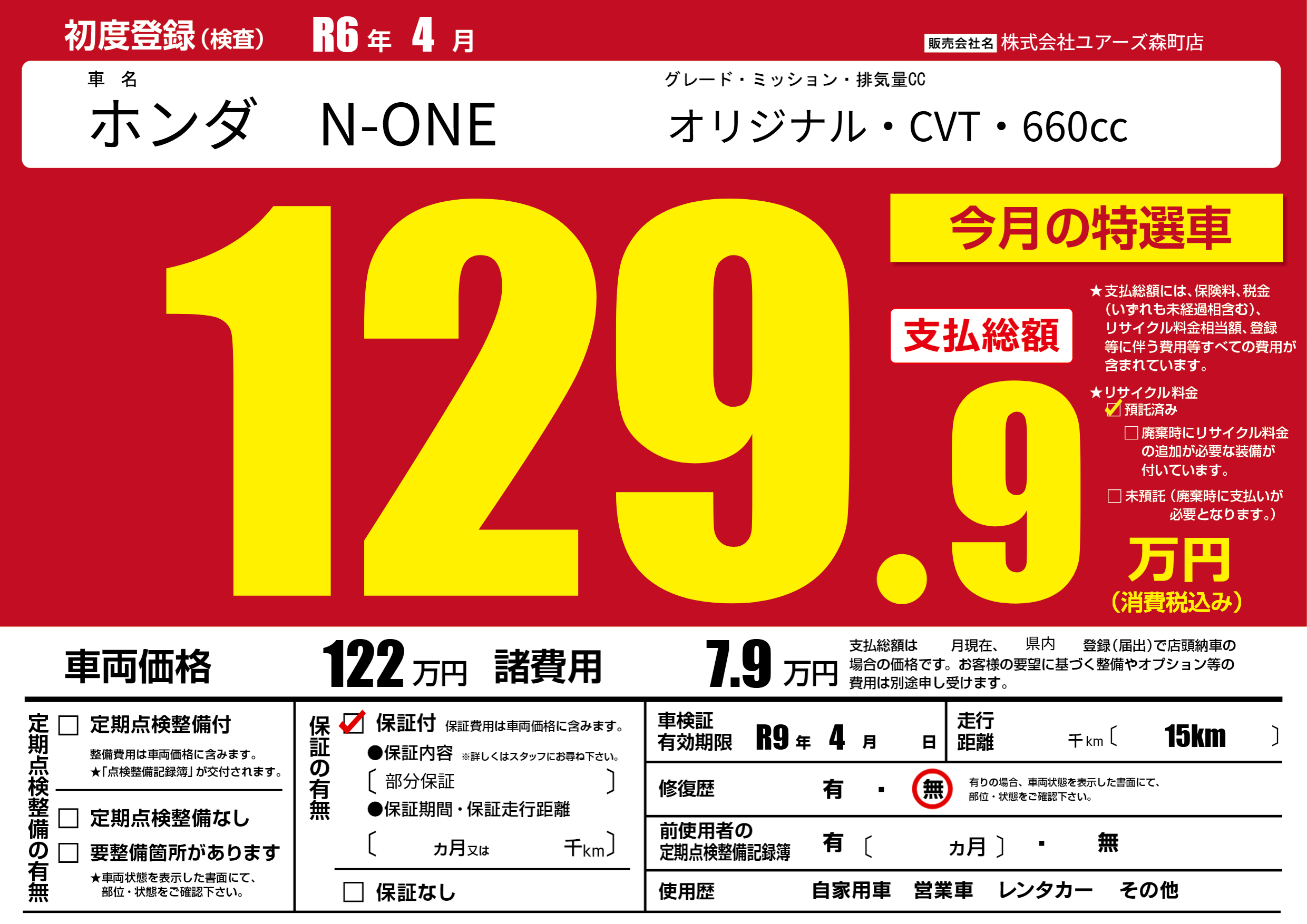 | 車名 | ホンダ N-ONE | グレード ミッション 排気量 |