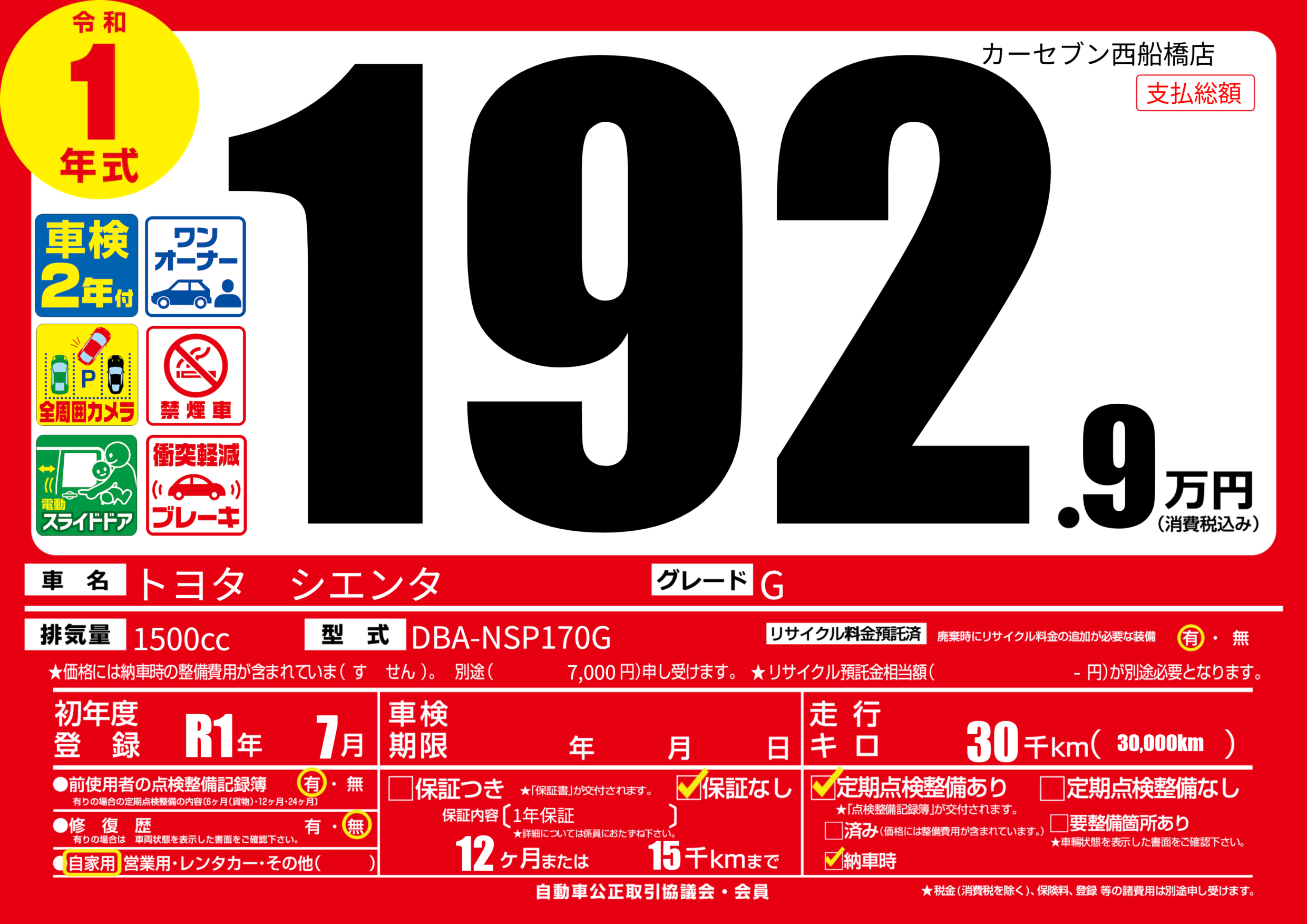 | 走行キロ | 3万km | 初年度登録 | R1年7月 |