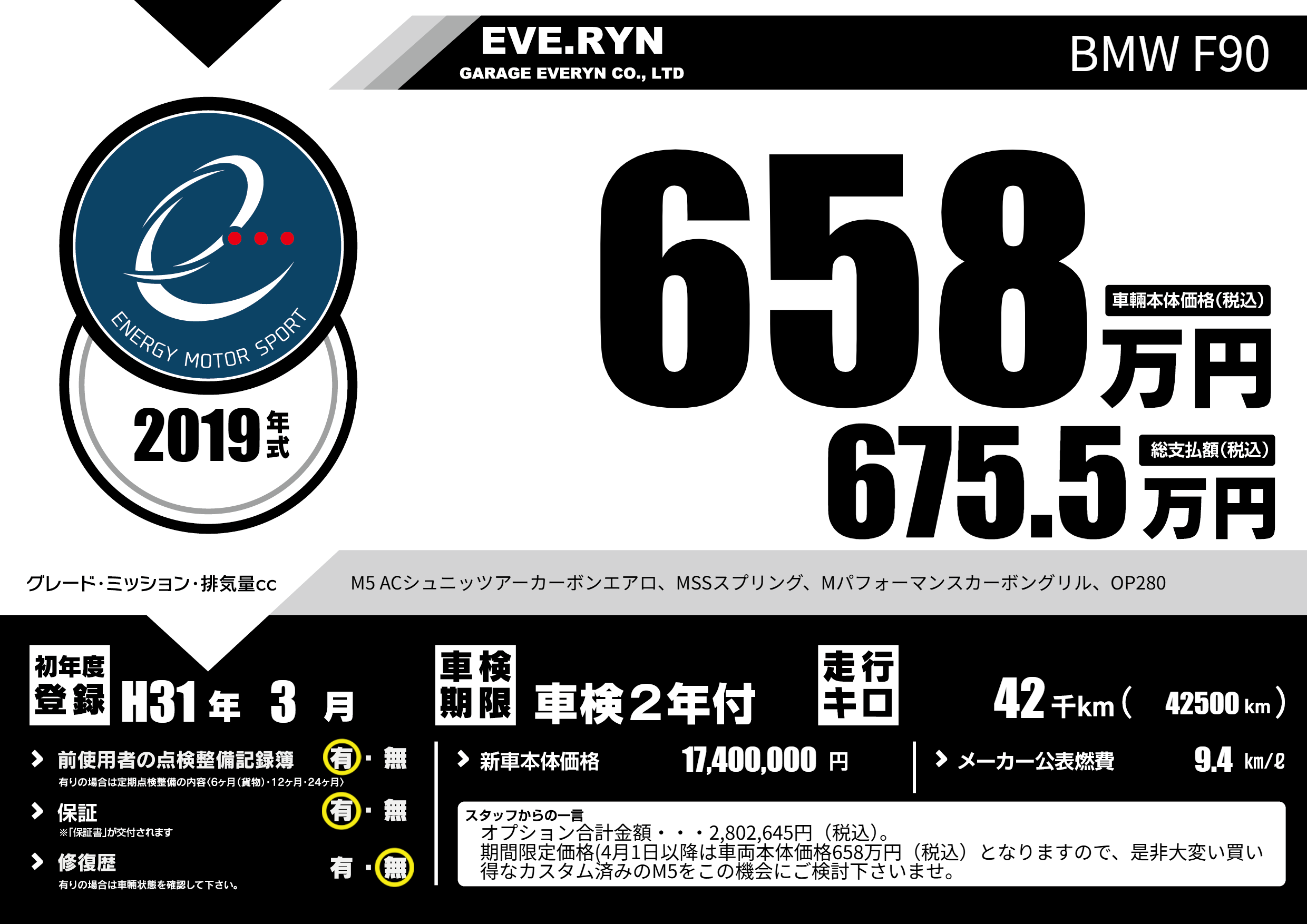 M5 ACシュニッツアーカーボンエアロ、MSSスプリング、Mパフォーマンスカーボングリル、OP280 |