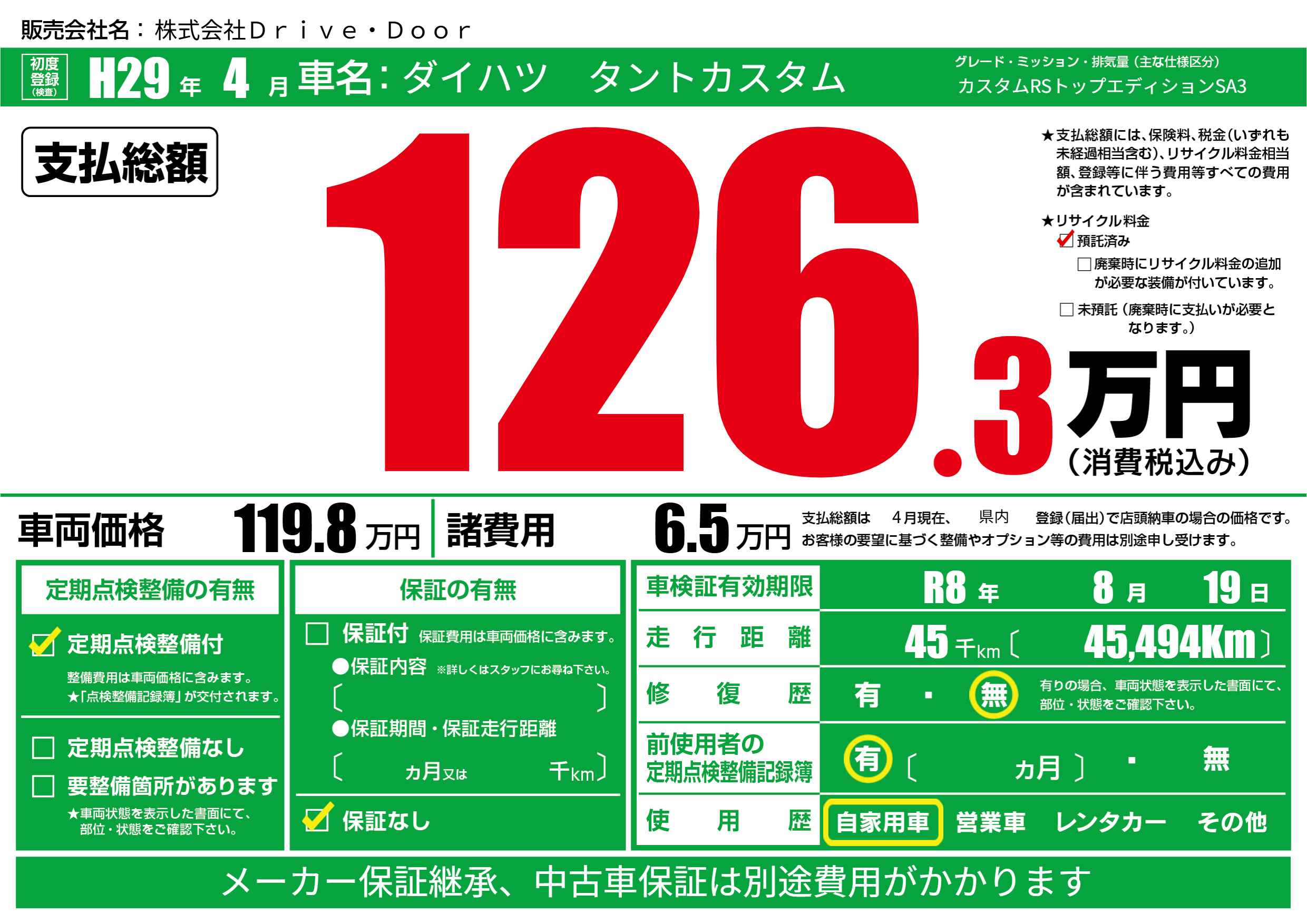 | 走行キロ | 4.5万km | 初年度登録 | H29年4月 |