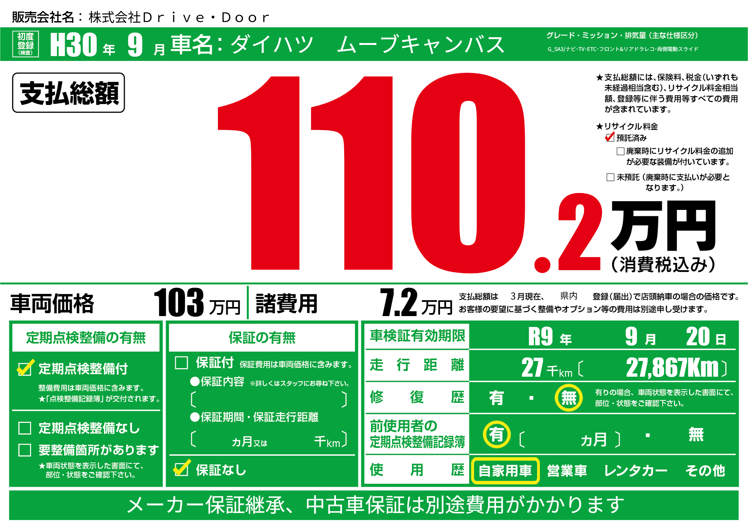 なし | 車検制限 | R9年9月20月 |