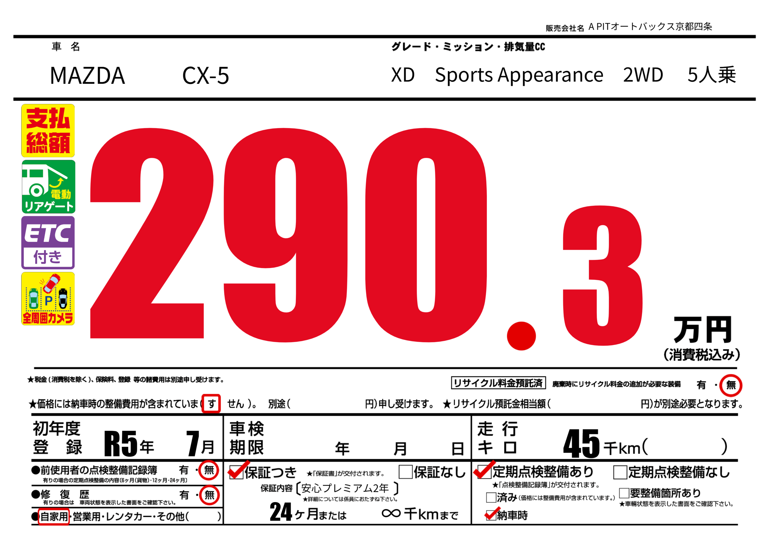 | 走行キロ | 4.5万km | 初年度登録 | R5年7月 |
