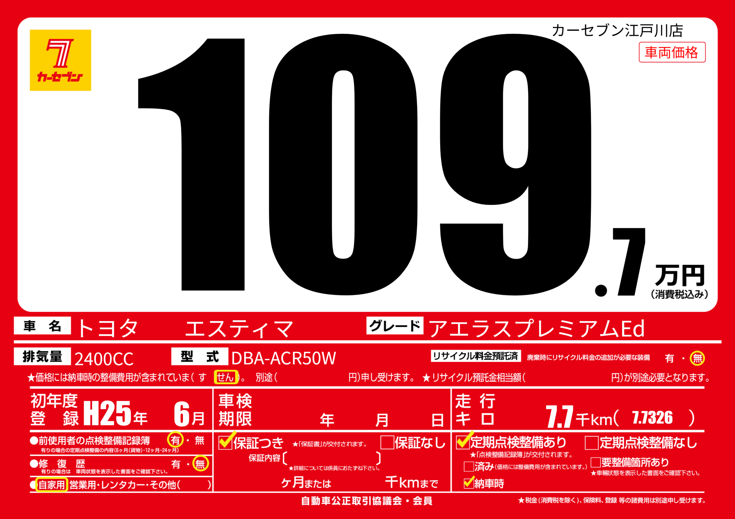 | 車名 | トヨタ エスティマ | グレード ミッション 排気量 |