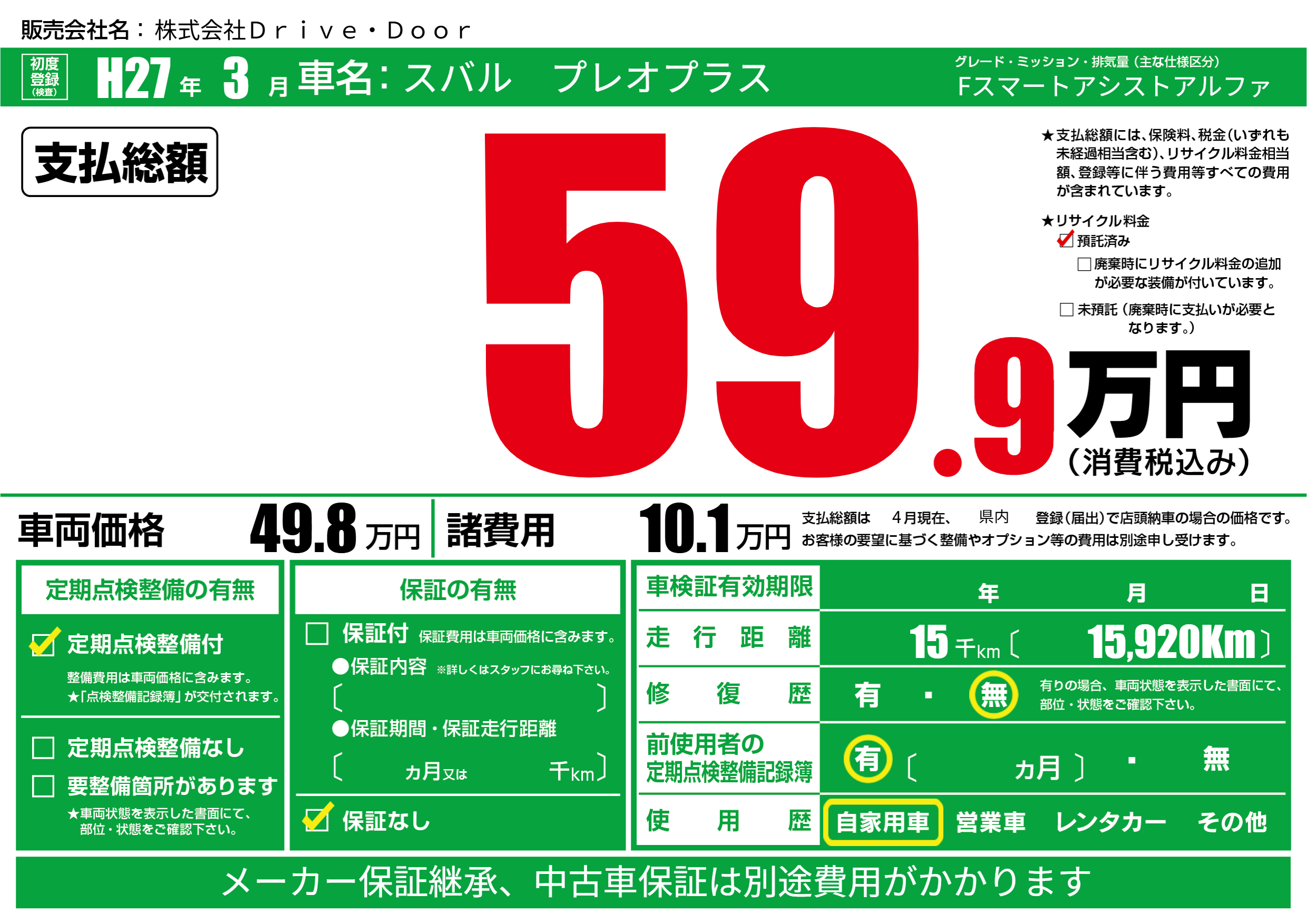 | 車名 | スバル プレオプラス | グレード ミッション 排気量 |