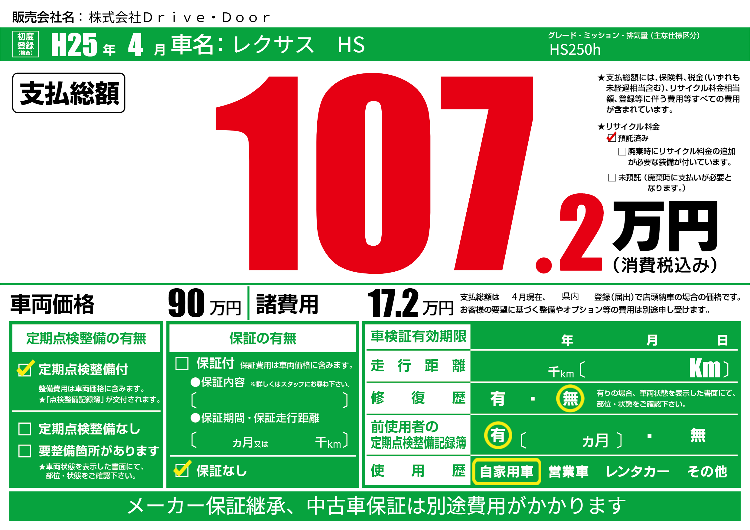 | リサイクル料金 預託済 |