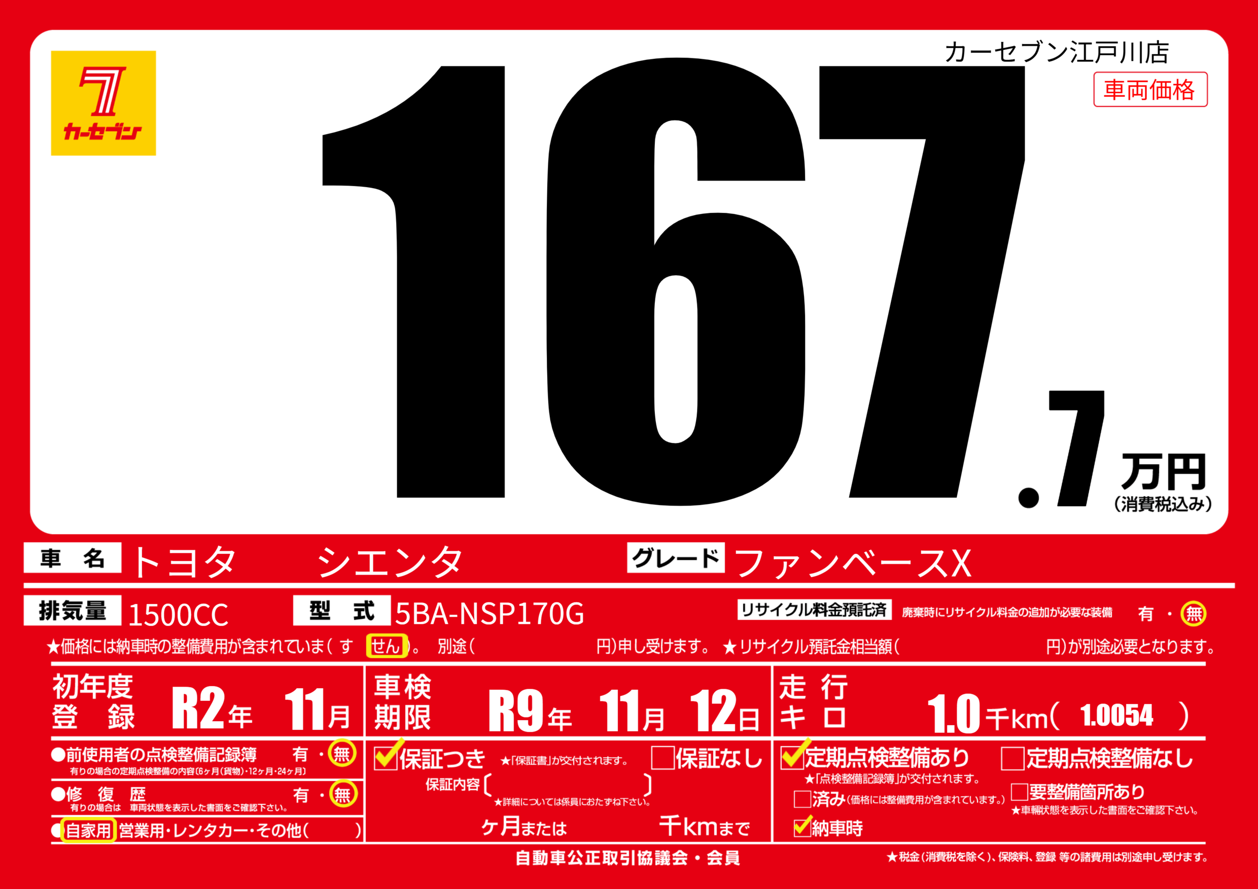 | 車名 | トヨタ シエンタ | グレード ミッション 排気量 |