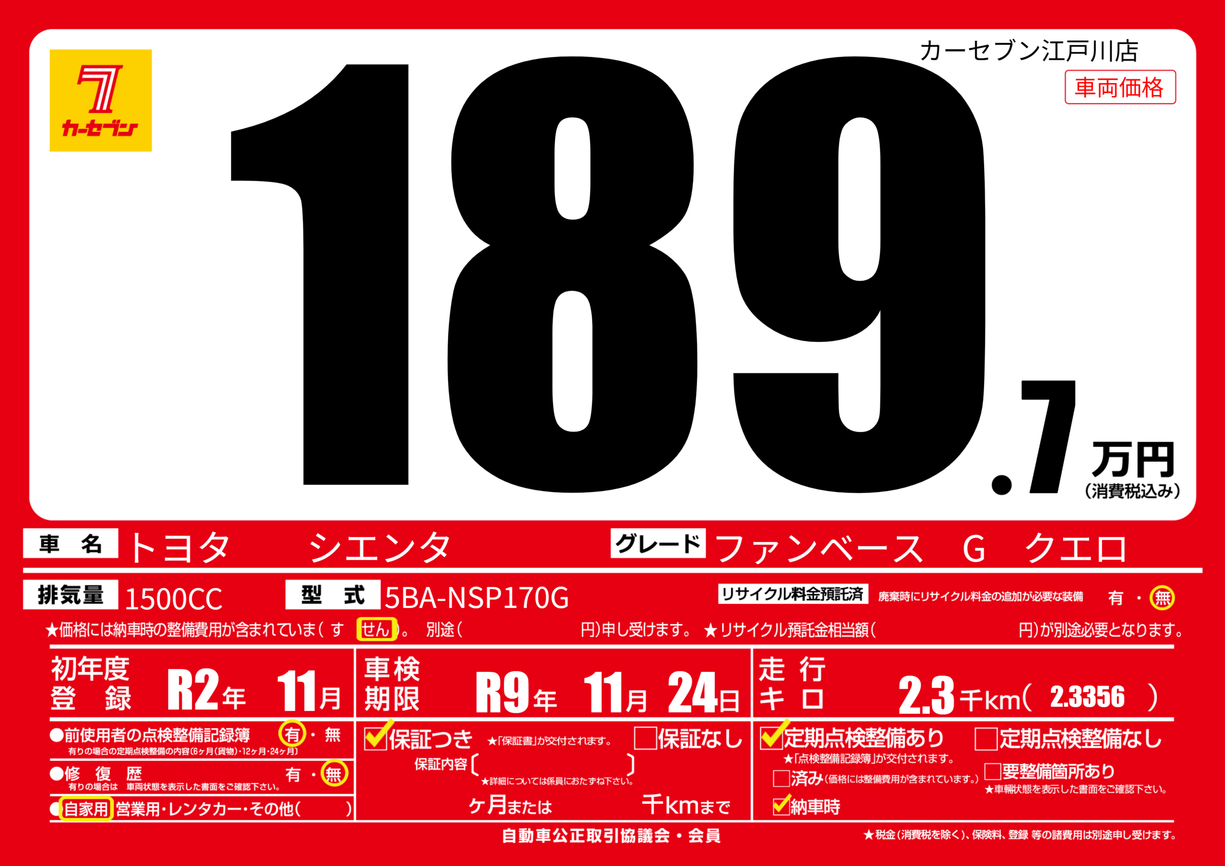 | 車名 | トヨタ シエンタ | グレード ミッション 排気量 |