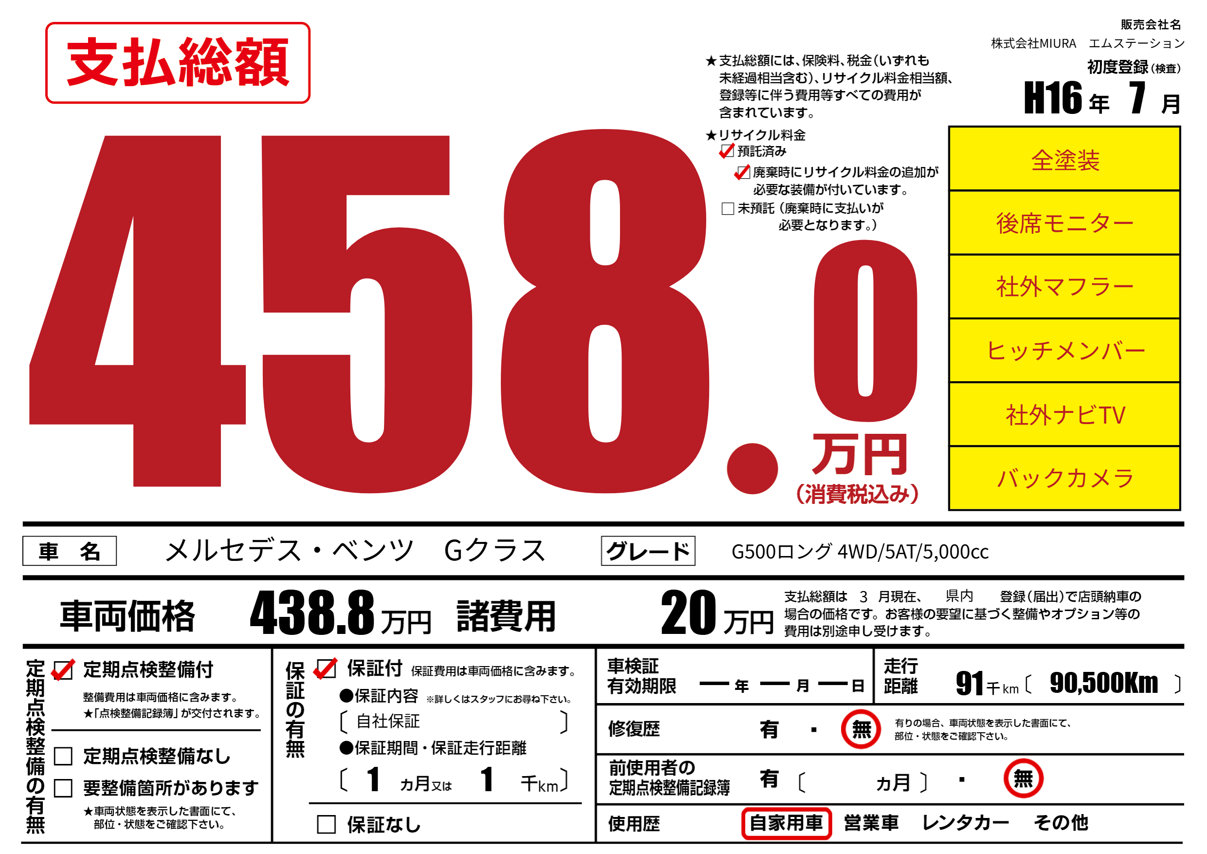 | 車名 | メルセデス・ベンツ Gクラス | グレード ミッション 排気量 |