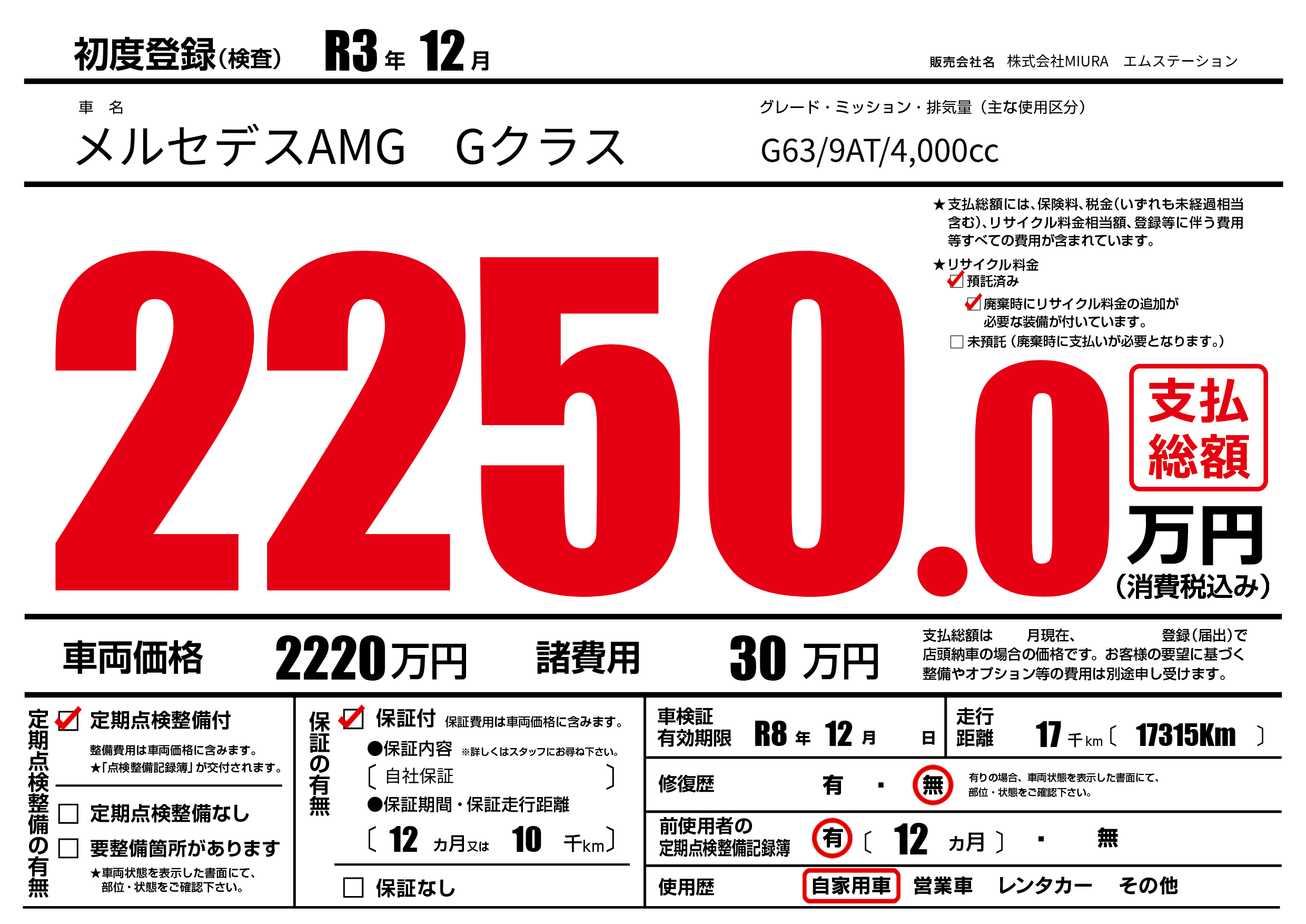 | 車名 | メルセデスAMG Gクラス | グレード ミッション 排気量 |