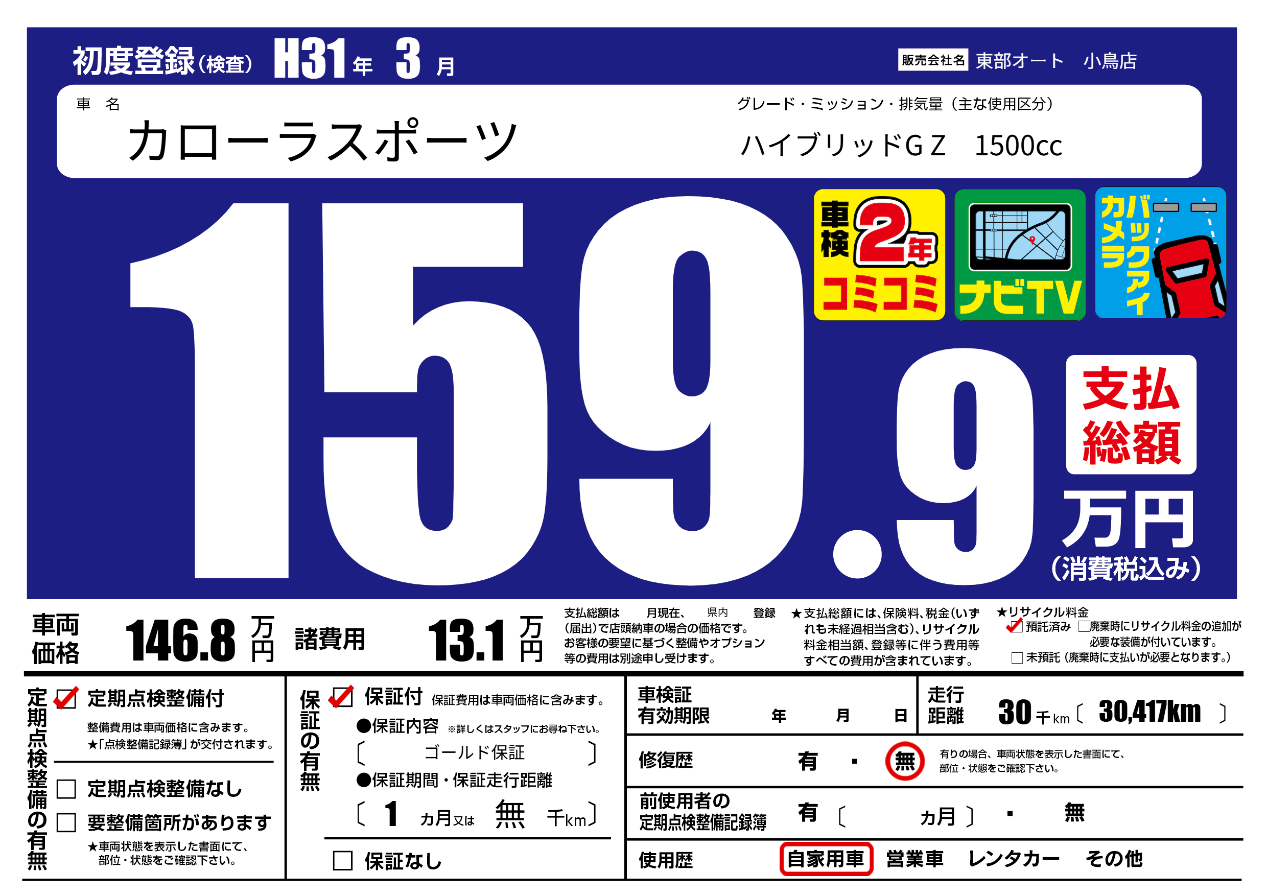 | 走行キロ | 3万km | 初年度登録 | H31年3月 |