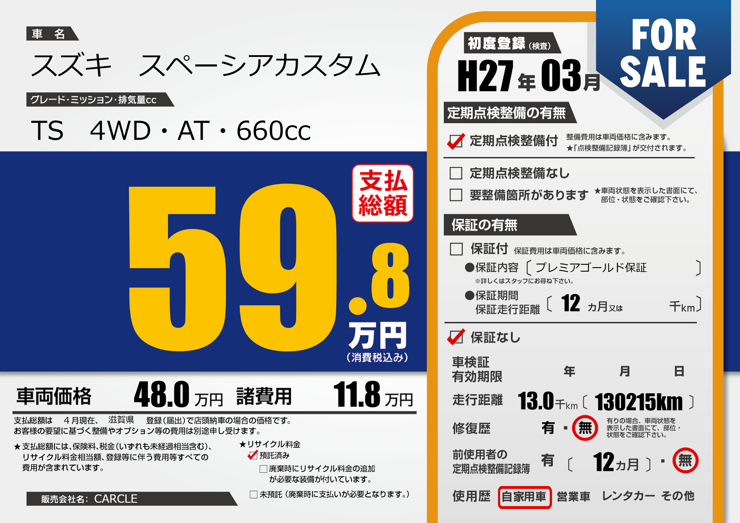 | 車名 | スズキ スペーシアカスタム | グレード ミッション 排気量 |