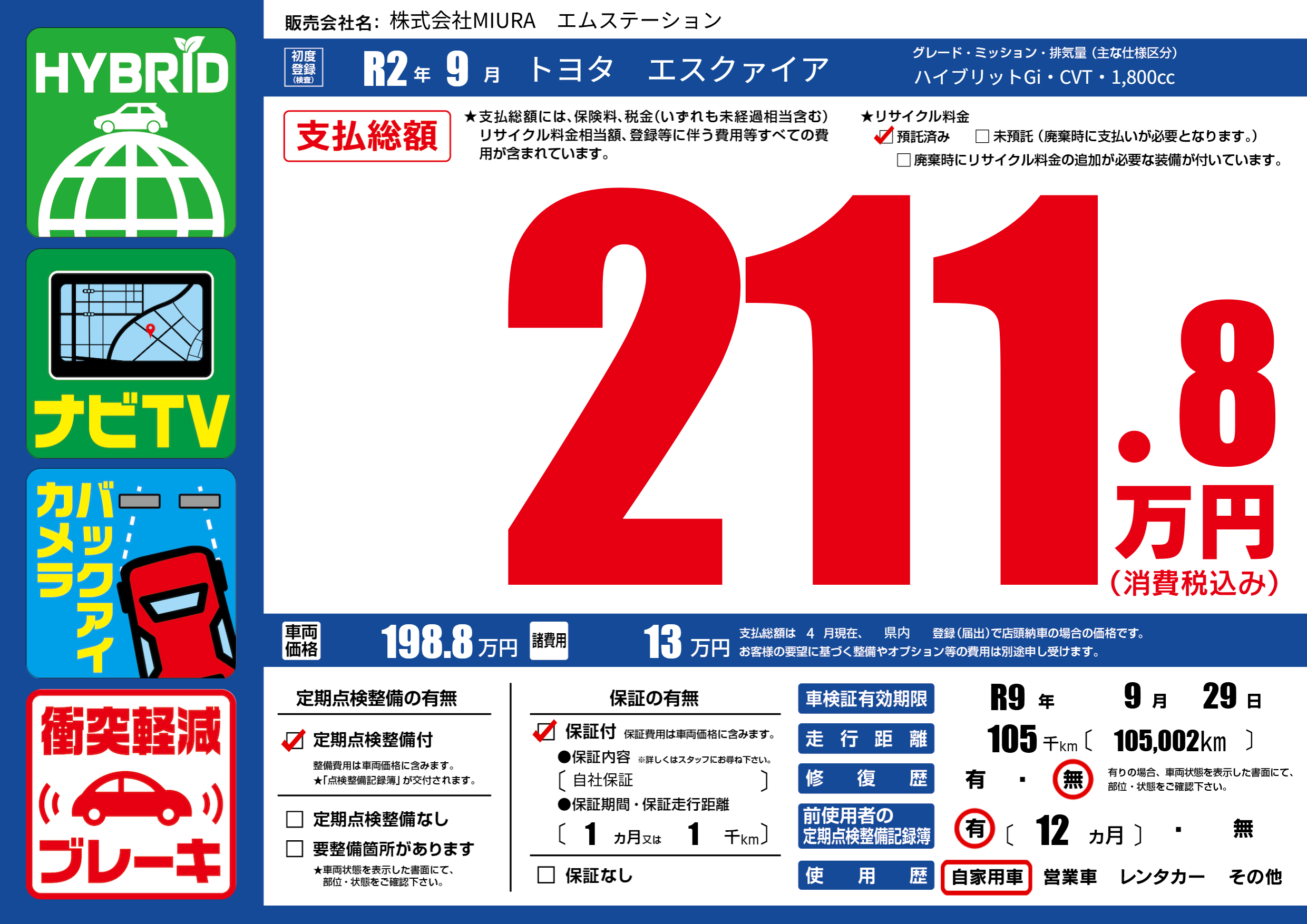 | 車検制限 | R9年 9月 29日 | ||