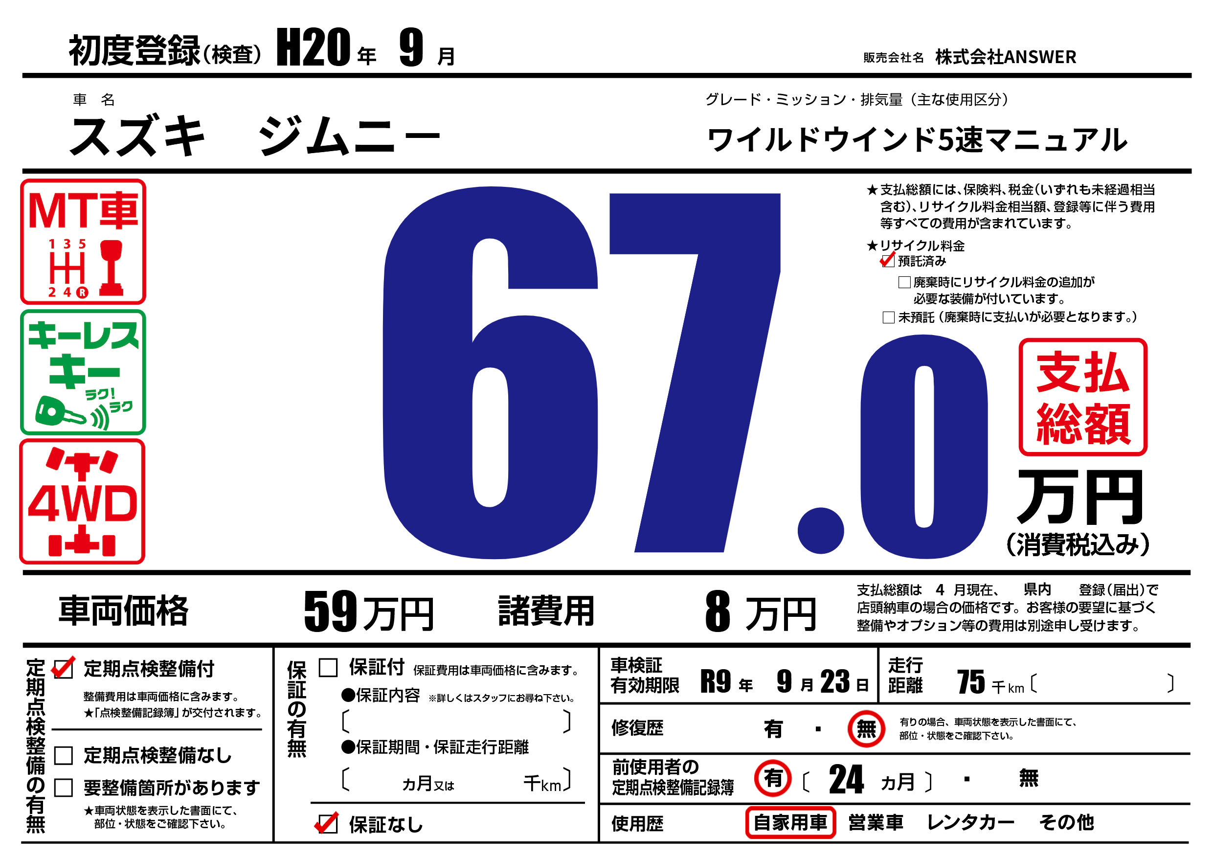 | 走行キロ | 7.5万km | 初年度登録 | H20年9月 |