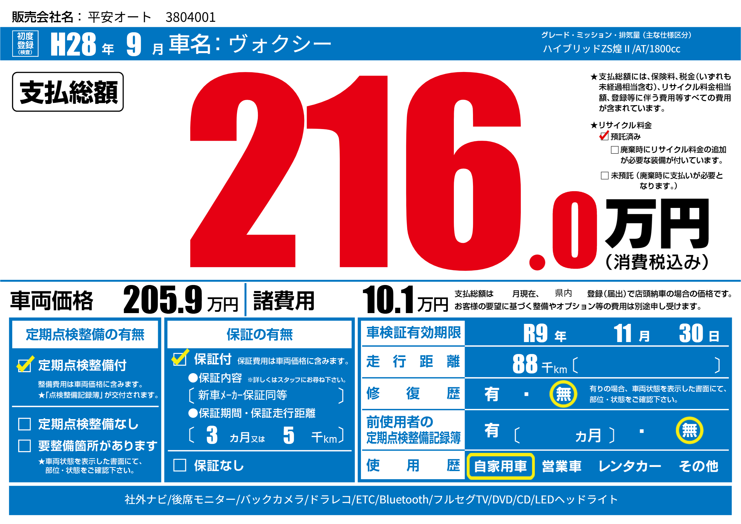 なし | 車検制限 | R9年11月30月 |