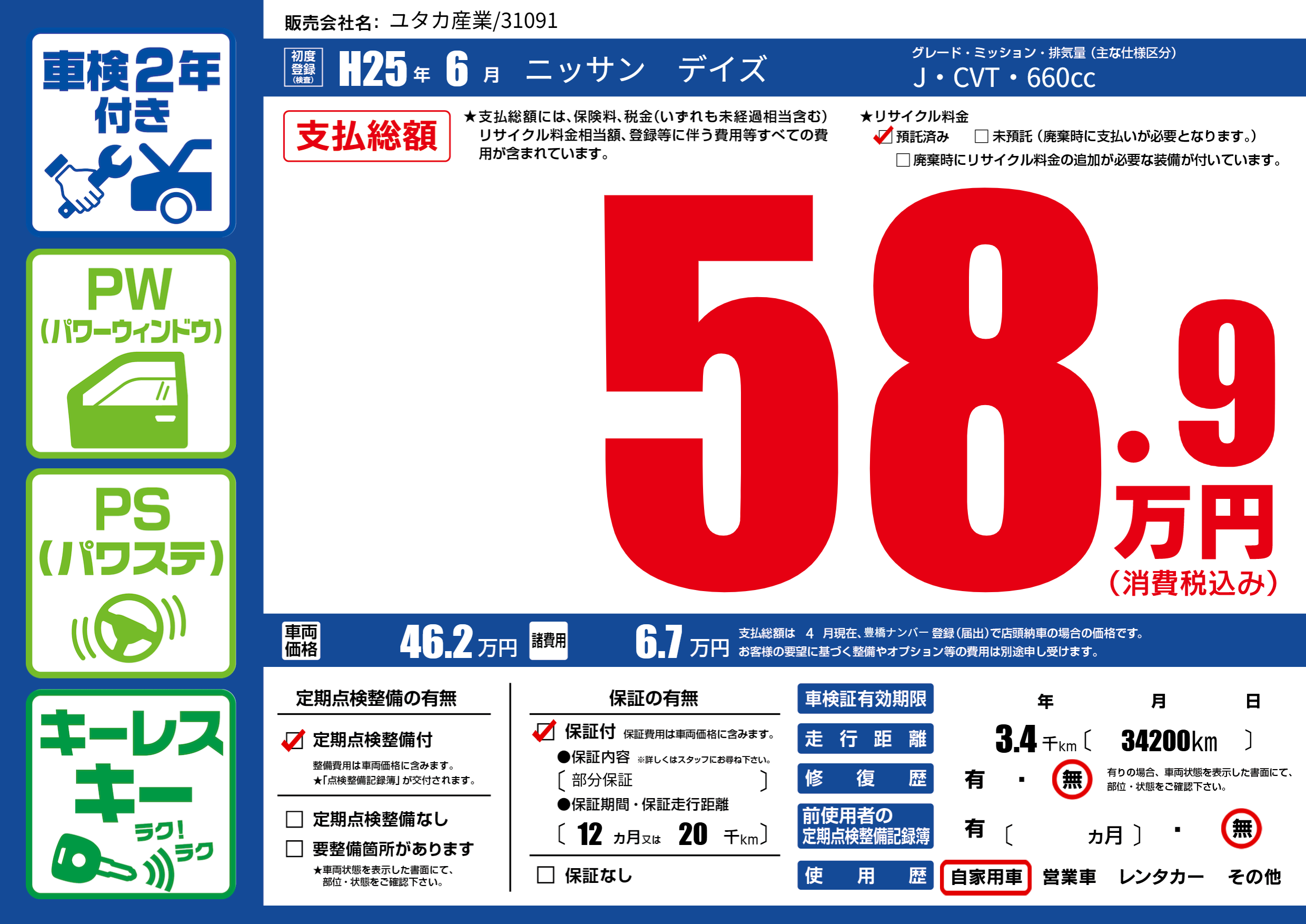 | 車名 | ニッサン デイズ | グレード ミッション 排気量 |