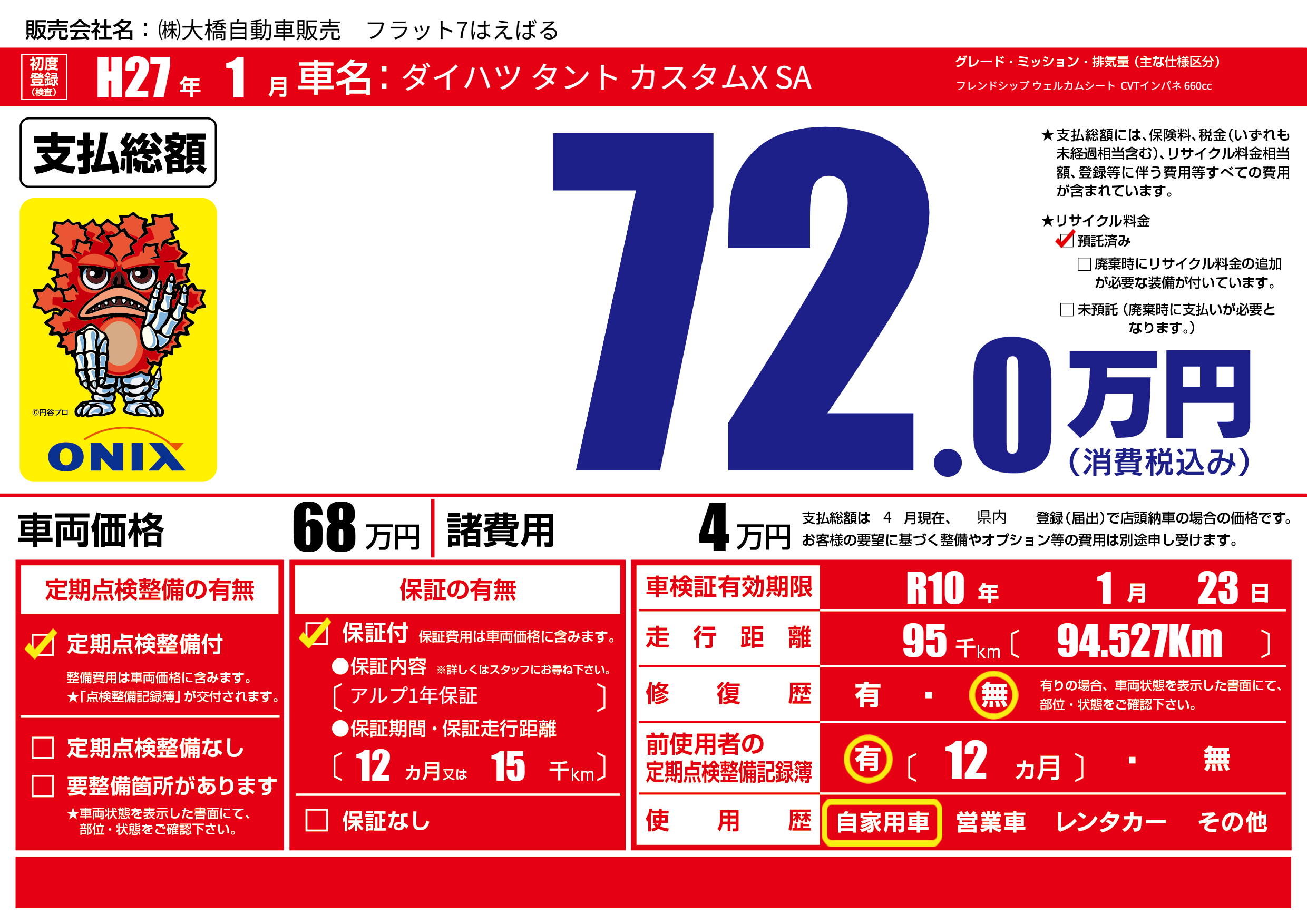 保証付き 保証内容(アルプ1年保証) 12ヶ月または(15)千kmまで |