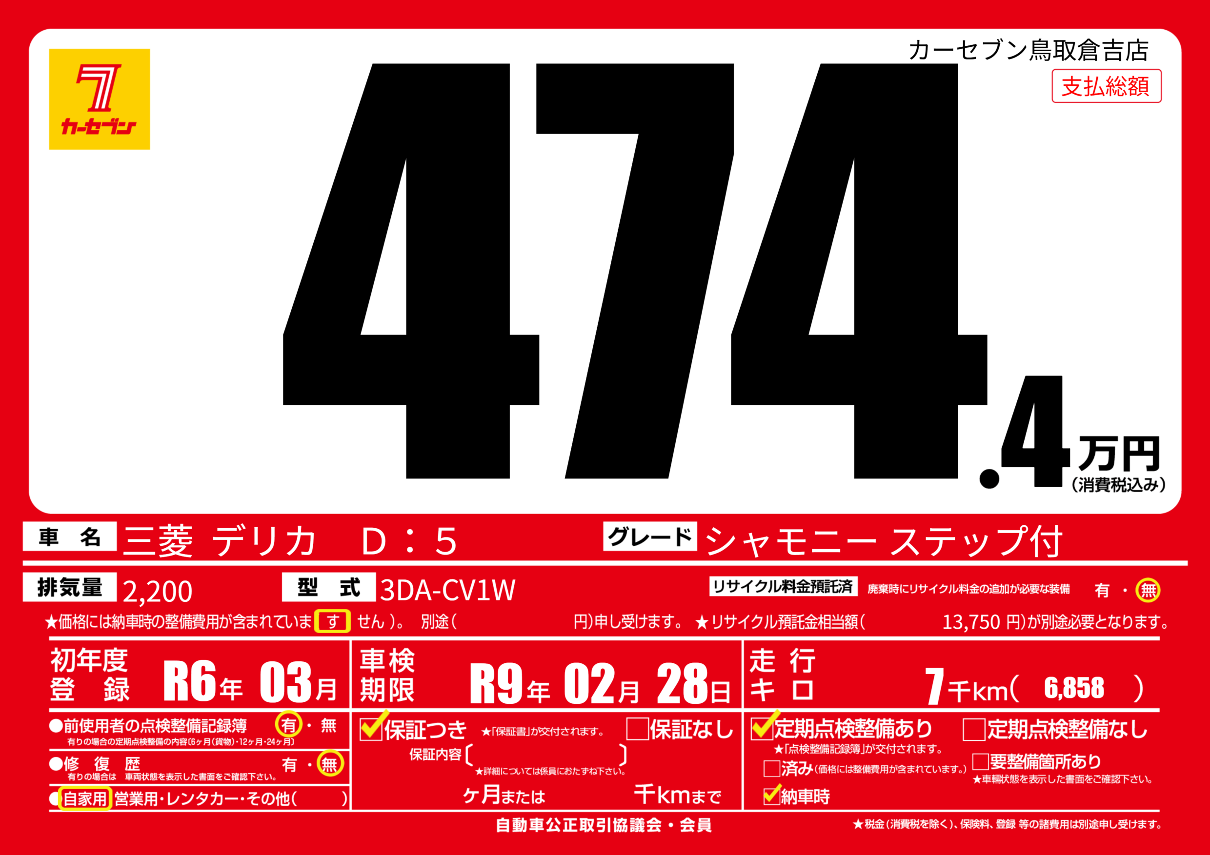 | 走行キロ | 0.7万km | 初年度登録 | R6年03月 |