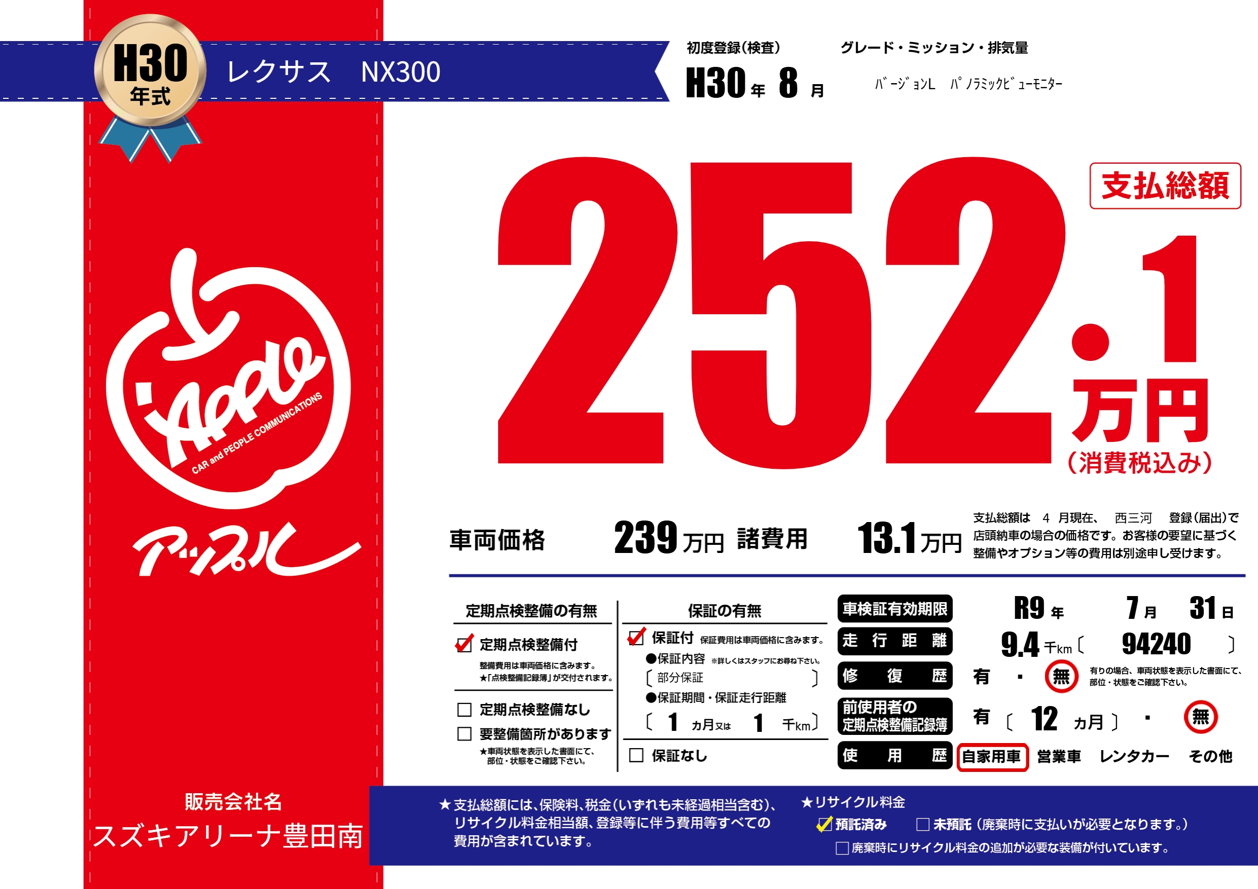 | 初年度登録 | H30年8月 | ||