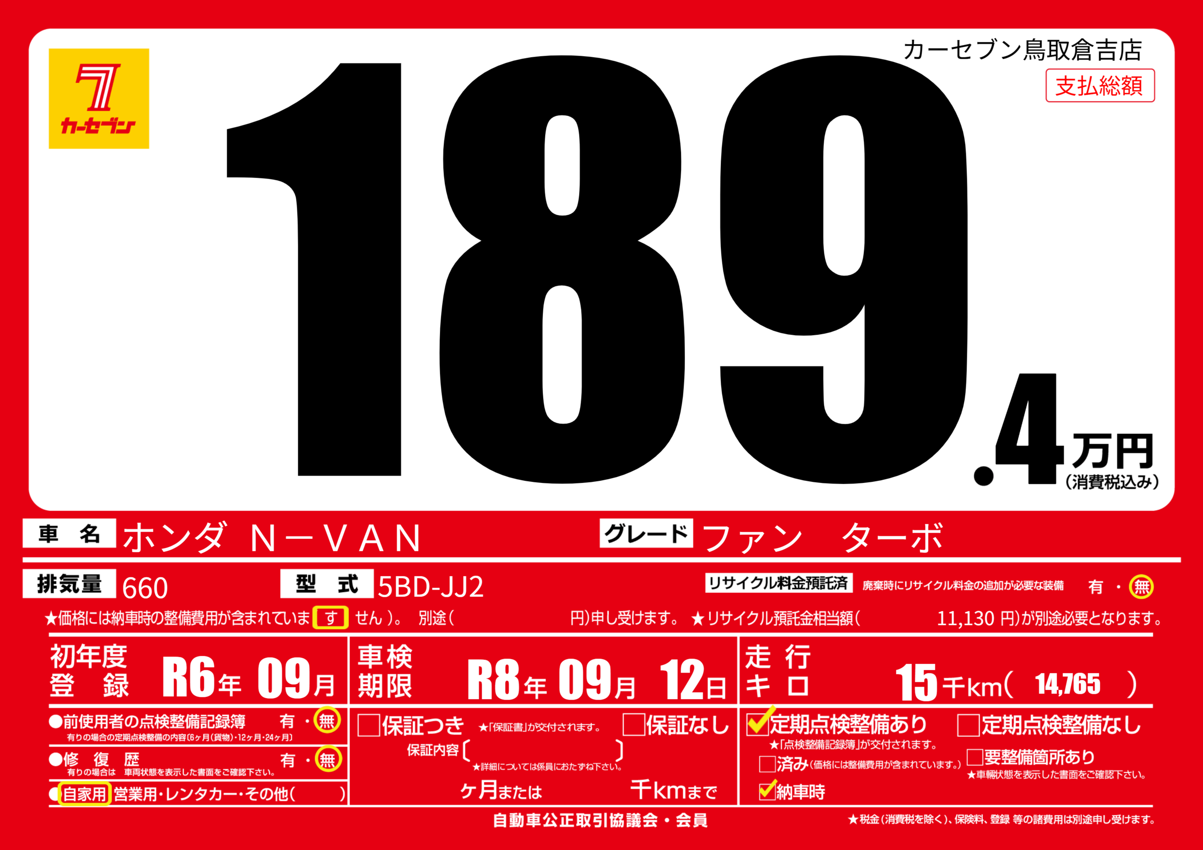 | 車名 | ホンダ N-VAN | グレード ミッション 排気量 |