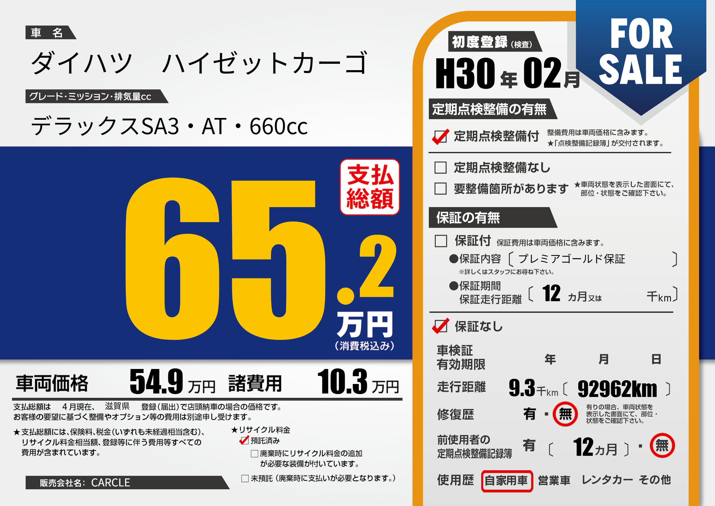 | 車名 | ダイハツ ハイゼットカーゴ | グレード ミッション 排気量 |