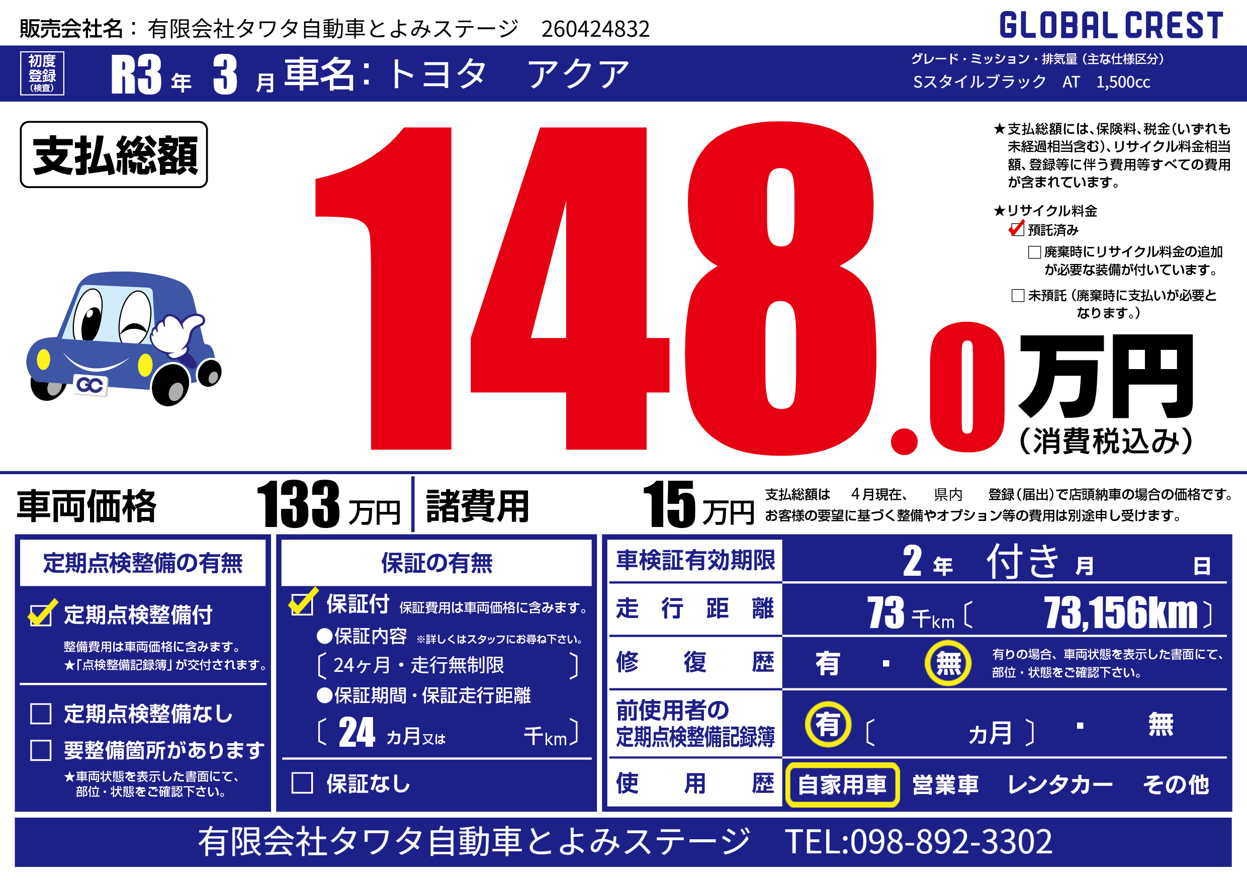 | 走行キロ | 7.3万km | 初年度登録 | R3年3月 |