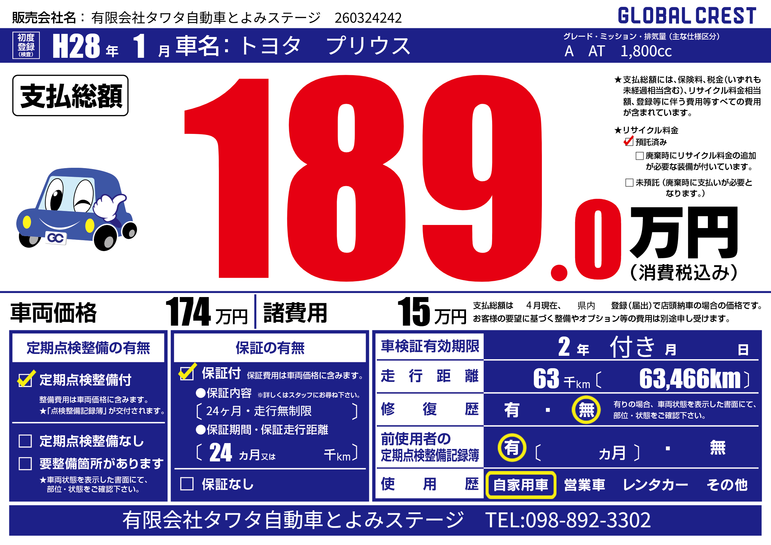 | 車名 | トヨタ プリウス | グレード ミッション 排気量 |