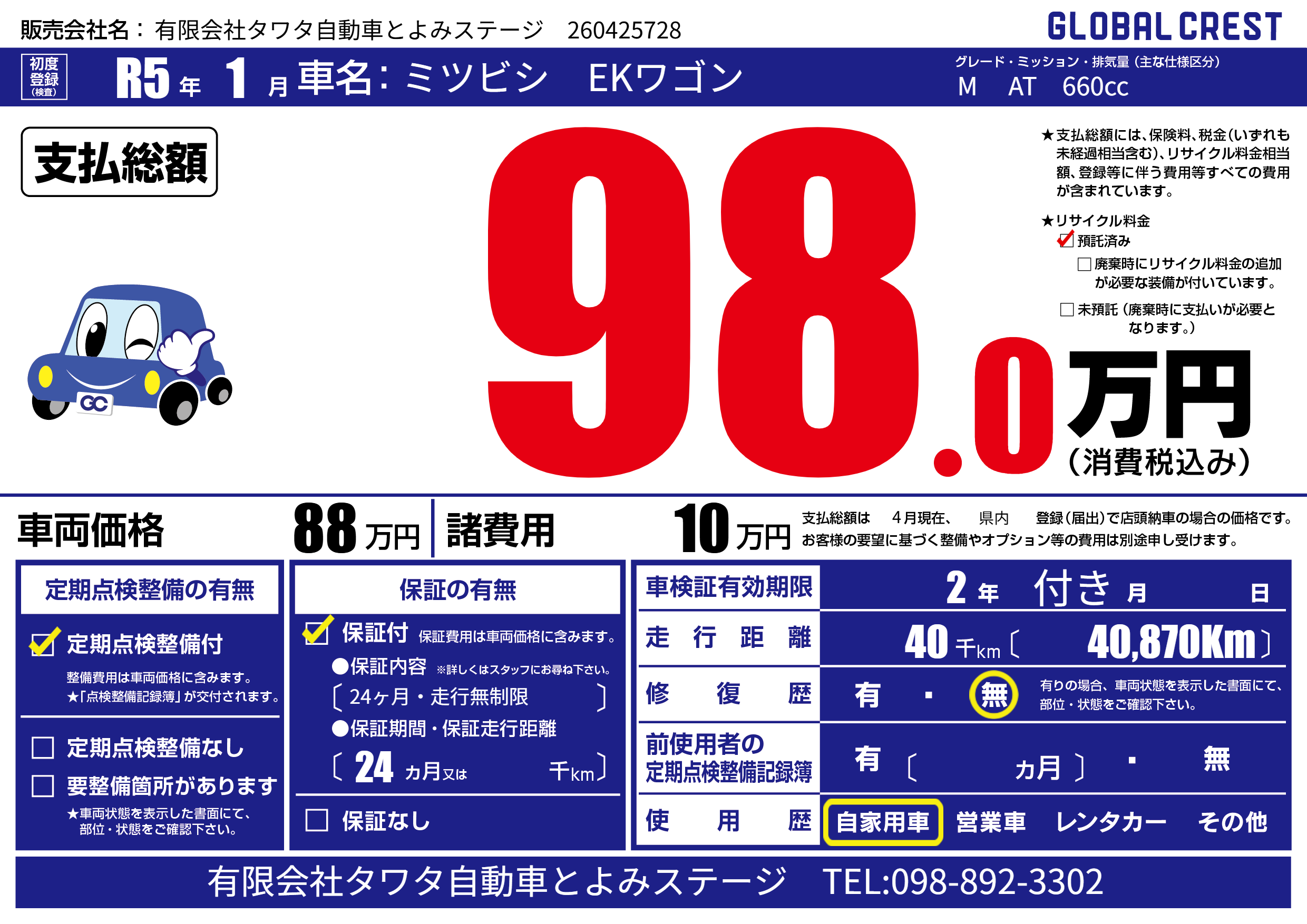 | 車名 | ミツビシ EKワゴン | グレード ミッション 排気量 |