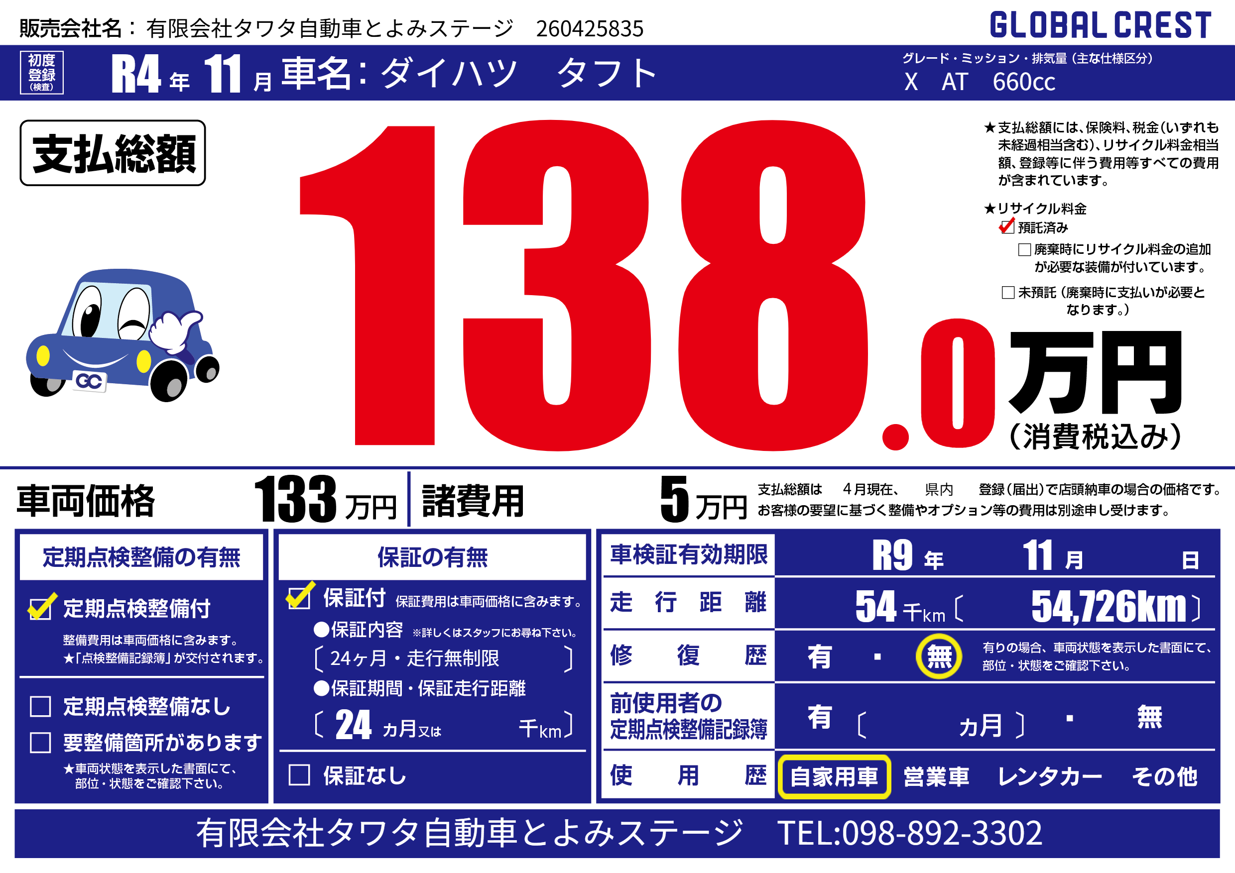 | 車名 | ダイハツ タフト | グレード ミッション 排気量 |
