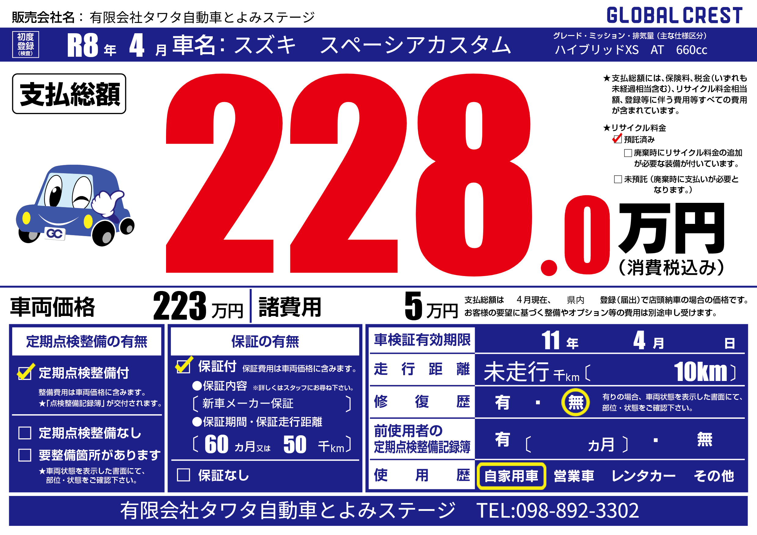 | 車名 | スズキ スペーシアカスタム | グレード ミッション 排気量 |