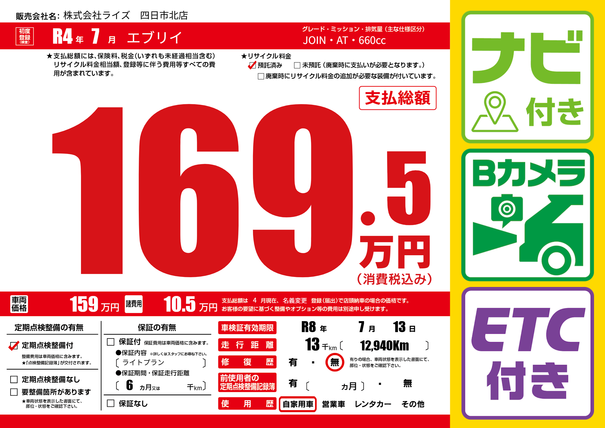 | 車名 | エブリイ | グレード ミッション 排気量 |