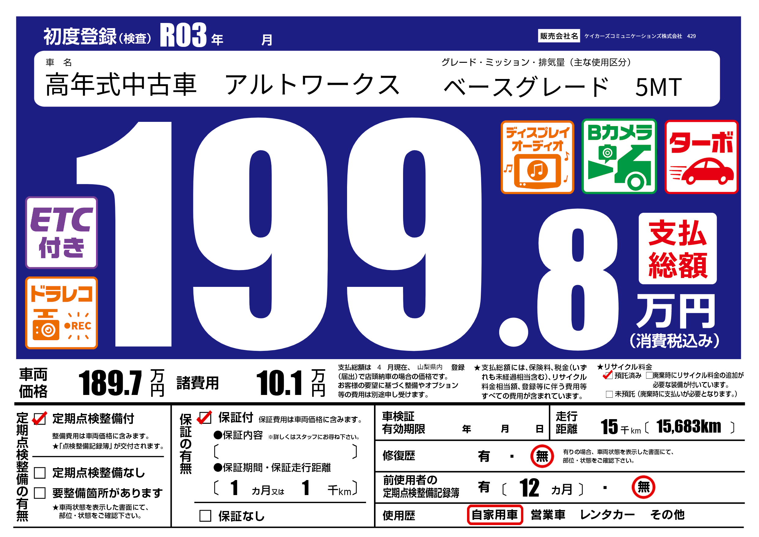 | 車名 | 高年式中古車 アルトワークス | グレード ミッション 排気量 |